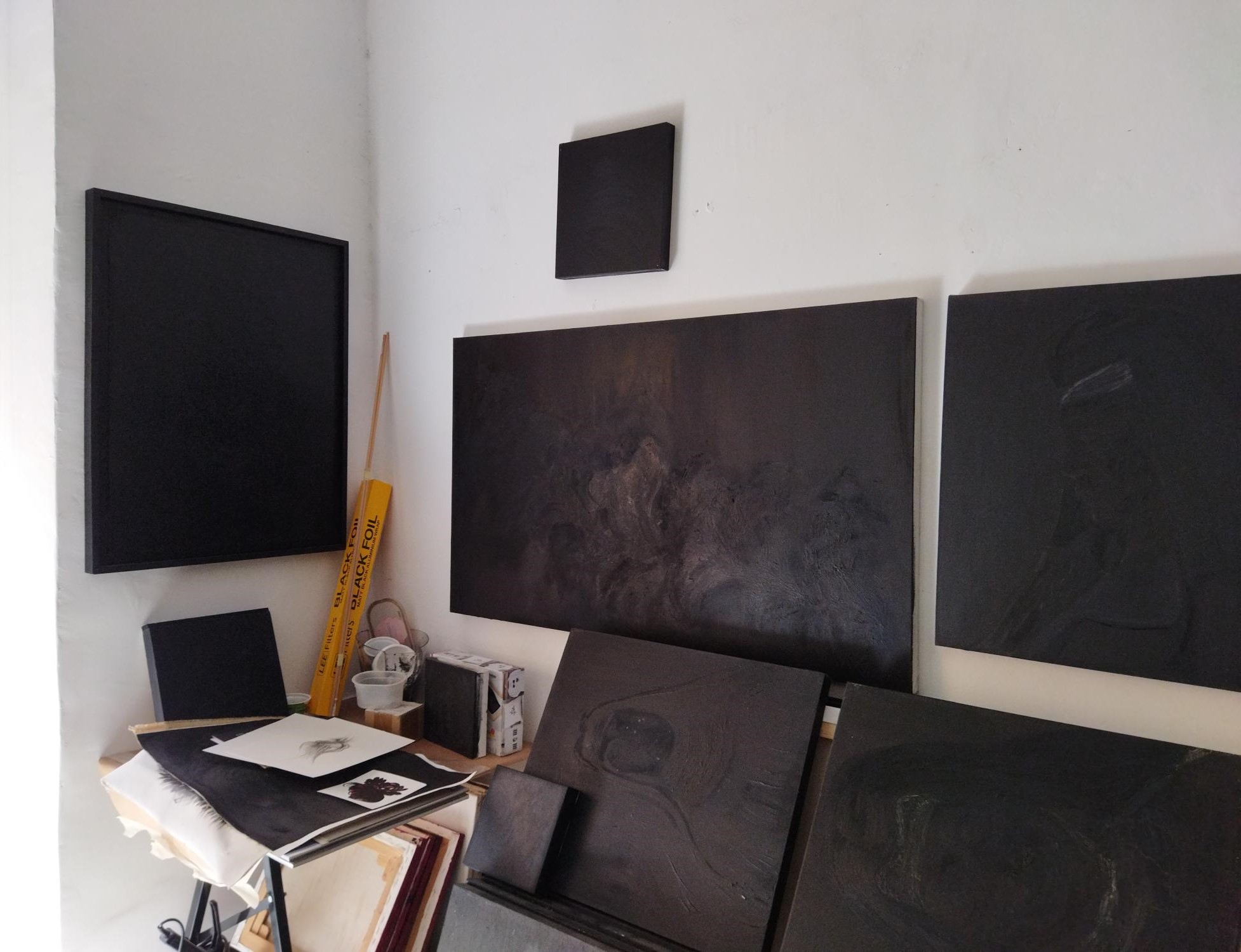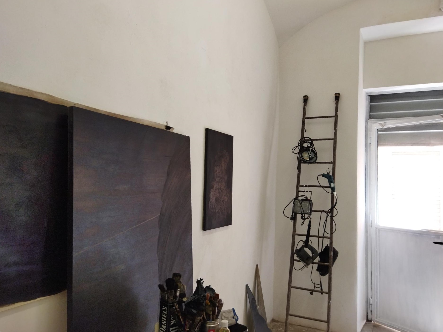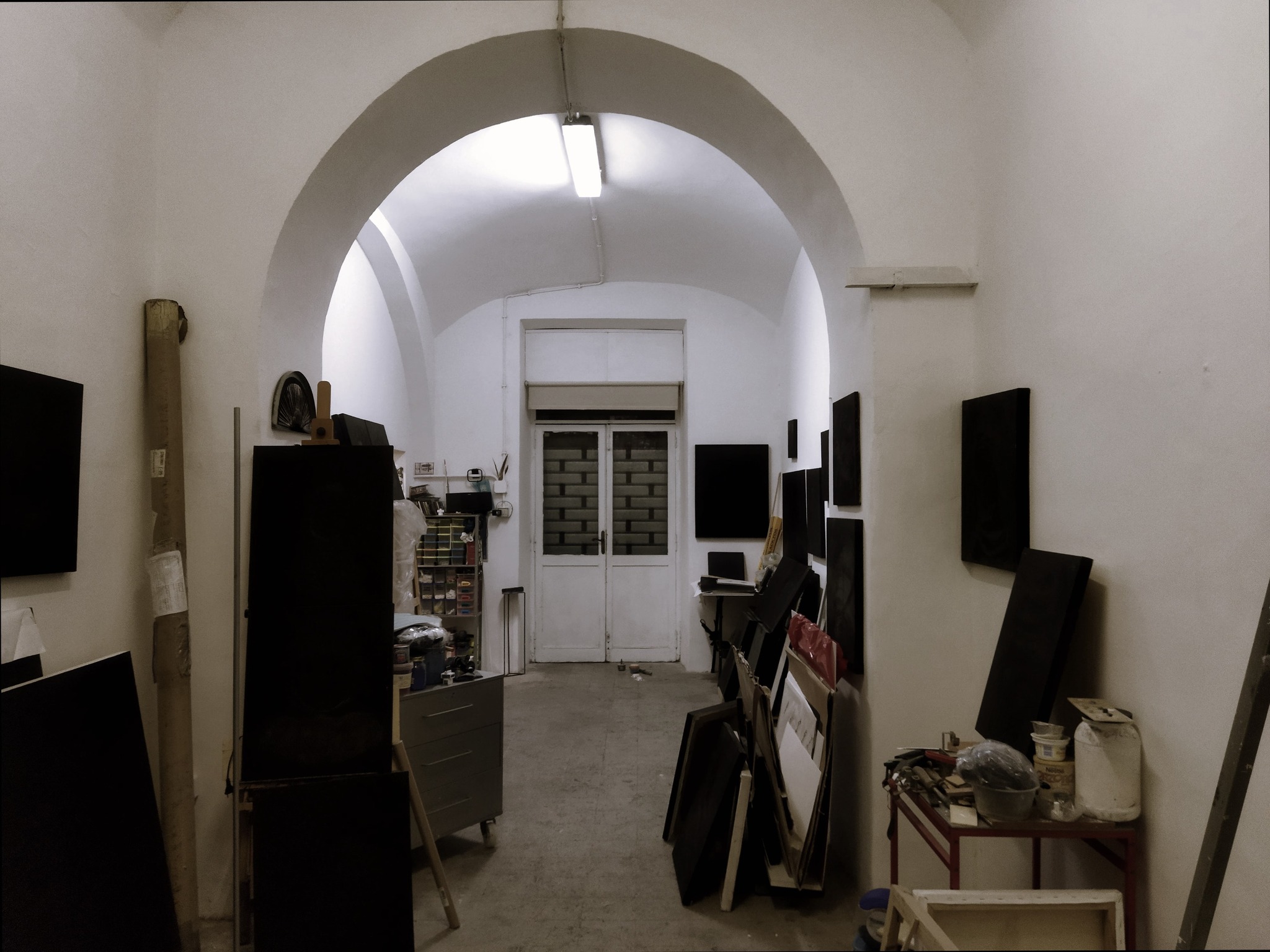 Sul terreno accidentale dello studio sono apparentemente incostante, ma nella lentezza trovo un modo di procedere disciplinato. Mi affaccio, sguardo a terra, il cortile grigio. Sguardo in alto, le facciate dei palazzi svettano, due affrontati e un terzo fa da parete di fondo, quasi nascondono il cielo. Una scatola che ti accoglie dopo la strada. Ogni volta che lo percorro, prima della fine, immagino di trovare Stroszek con la sua fisarmonica, forse sono a Berlino. Passo, saluto altri due artisti, Luigi e Alessandro.