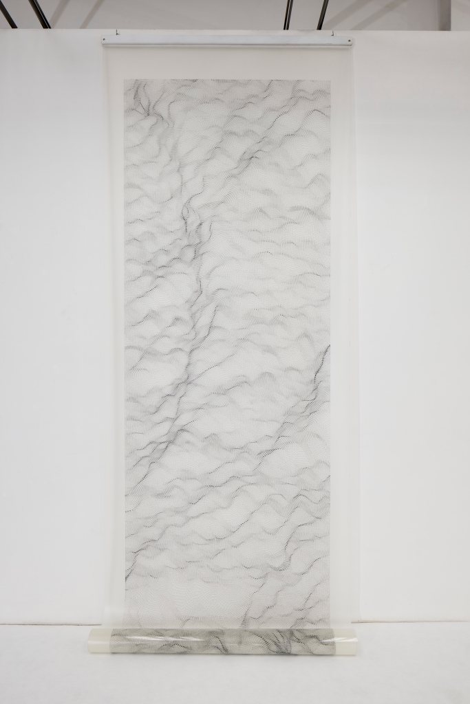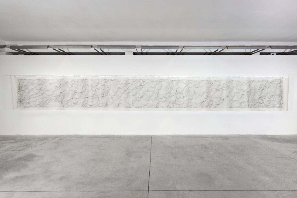 Flaminio Gualdoni: non è un abbaglio. Le “Costellazioni” sono una specie di variante poetica, infatti in questi lavori il segno perde completamente la sua memoria a vantaggio di un uso diverso dello spazio e introduce anche l’elemento del colore, inteso come monocromia dolce. Nelle “Costellazioni” Dada non usa il nero, che per lei era una specie di cifra stilistica che porterà avanti per tutta la vita. Quello di Dada è proprio un graphein, un segnare. Nelle “Costellazioni” cercava come una sorta di respirazione del foglio, un abbandono per lei abbastanza inconsueto. Quando torna al nero allora si ritrova la durezza, la secchezza del suo segnare che però ne “Il movimento delle cose” ha più a che fare con il tempo. Secondo me la caratteristica dei grandi rotoli, io li chiamo così perché è così che sono conservati, è il tempo, e devo dire che uno dei maggiori pregi di questa mostra a Firenze è proprio nello spazio della galleria Frittelli che consente di esporre in questo modo così esteso il lavoro di Dada dandogli di fatto una consistenza che diversamente non potrebbe avere.