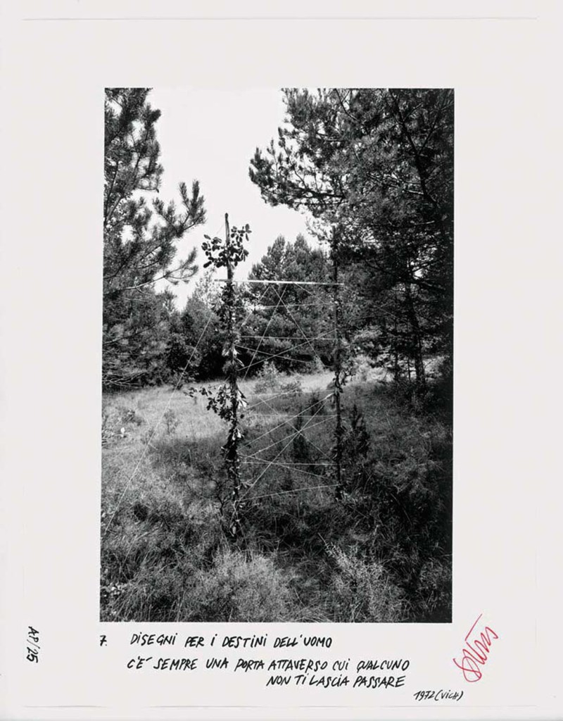 In una natura di alberi comuni, dove ti aspetteresti di veder apparire il dio Pan con lo zufolo e un codazzo di ragazzone (e Pan l’eterno che su l’erme alture / a quell’ora e nel pian solingo va) il nostro amico, famoso architetto, hippy per attitudine, fa apparire una delicata architettura, fatta di spago e bacchette, per evitare le gore della commissione edilizia. Mi immagino Ettore che carica al mattino le bacchette e lo spago in macchina e poi parte per ignote destinazione e si ferma quando gli pare, quando vede alberi pánici, buoni anche per fare pipì. Scende, mette il freno a mano (non si sa mai), guarda attorno che non ci siano quelli della commissione edilizia e in quattro e quattr’otto erige il suo edificio metaforico dove si compiono i destini dell’uomo. Costruisce la porta attraverso cui passare, alla faccia di chi ci vuol male, però poi ci ripensa e tesse una tela di spago nel passaggio: no pasarán.