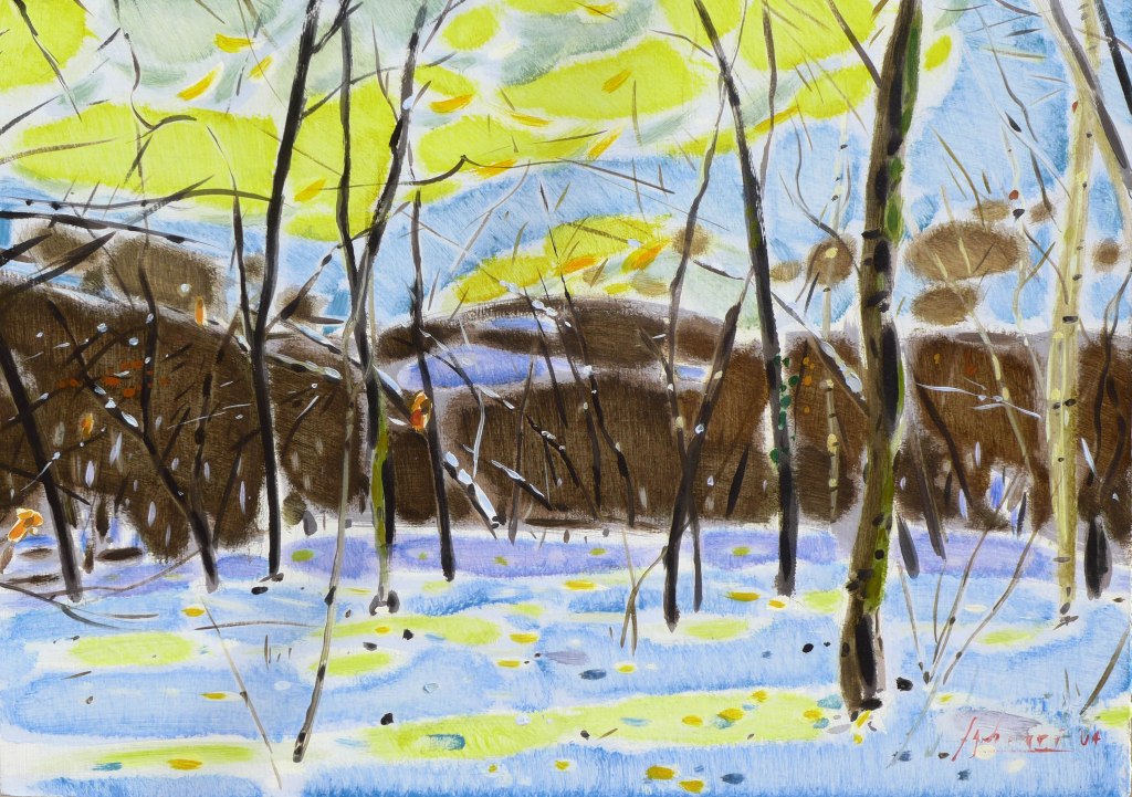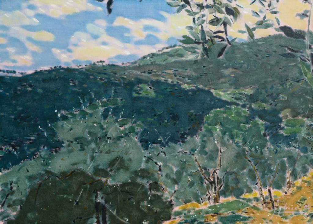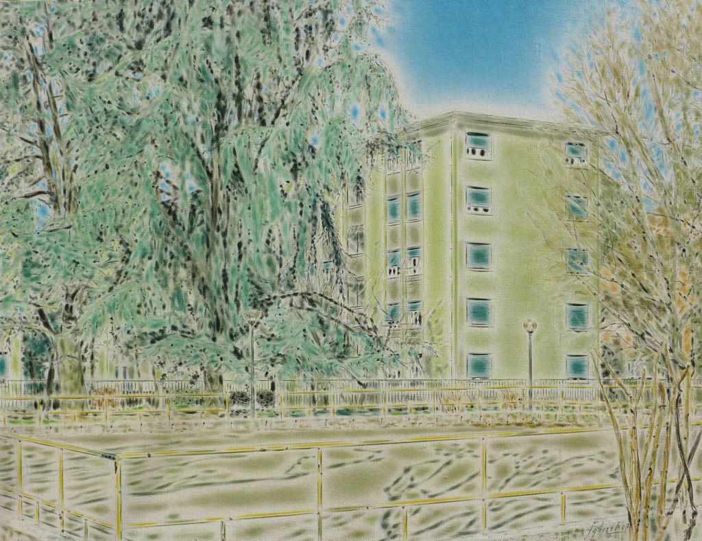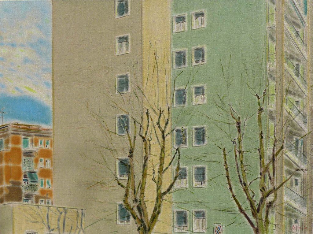 Nei campi; nei giardini periferici appartati, dove la vegetazione incolta contrasta la geometria moderna dei palazzi. Un pullulare di avvolgibili e finestre; balconi sporgenti allineati, vetri, ringhiere; luce calda e fredda immobile e in movimento. Superfici lisce, taglienti, spigolose; polverose del passato e presente. Non capisco i macchiaioli e gli impressionisti con i quali sono nato e cresciuto; per questo serve tempo e distacco. Dunque dovevo ricominciare da dove non avevo lasciato: dal suo contrario. Poco importa se un lavoro è poco originale, conforme, non attuale. L’Arte è anche imitazione.