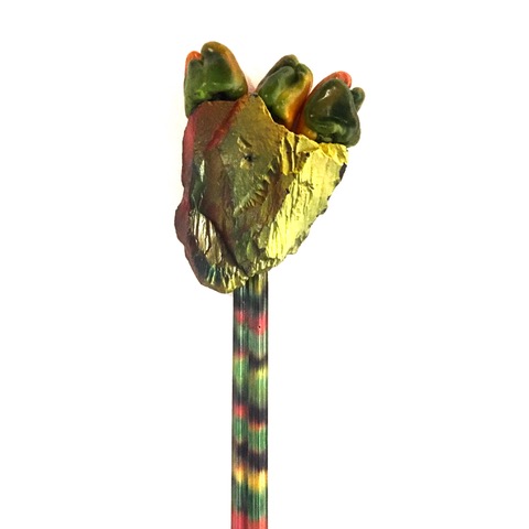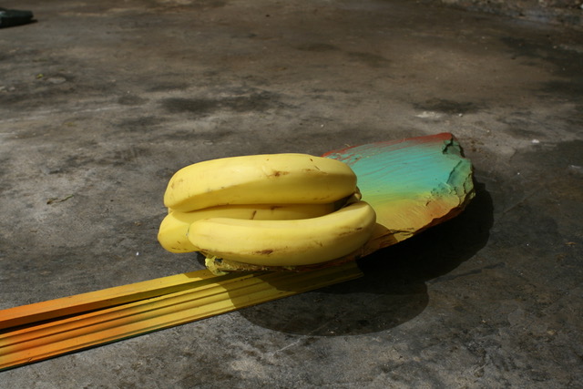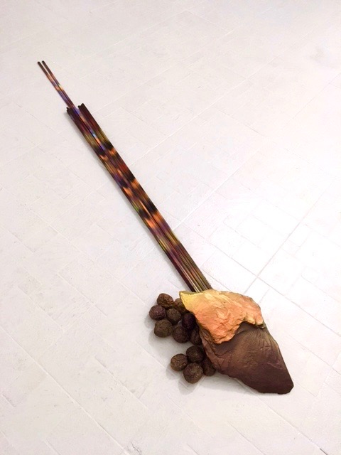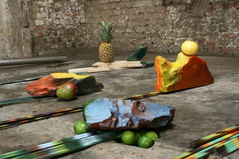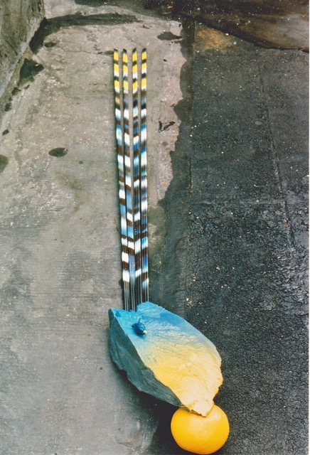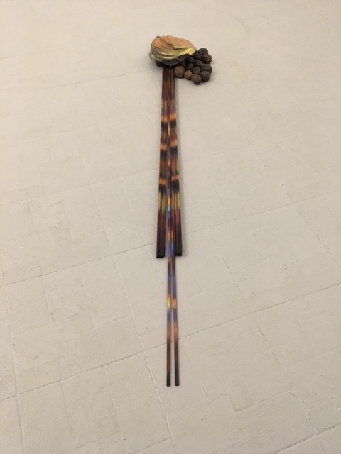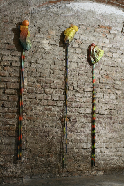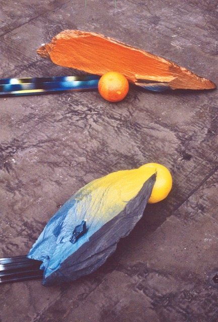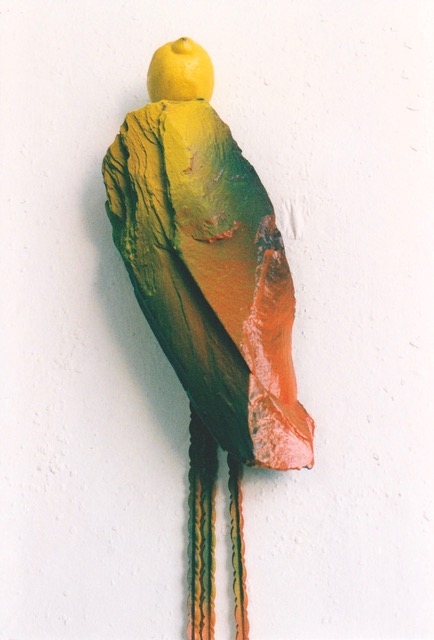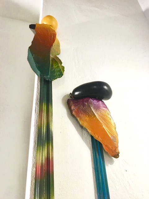 Ma poi mi diverto a ritrovare in qualsiasi frutta o verdura l’andamento del colore dei lavori. Per esempio, i peperoni giallo verdi sono fantastici: un po’ di umorismo non guasta mai. I primi che ho fatto sono a terra, poi altri li ho forati e “sfacciatamente” appesi come veri ara. In pratica possono stare sia a terra che appesi.