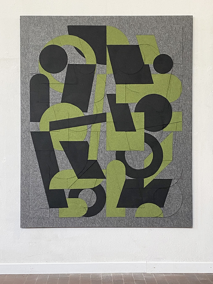 A.T.: E’ vero, questa fisicità è presente in diversi cicli di lavoro, non in tutti. In alcuni più datati ma anche in alcuni recenti, parliamo solo di opere a parete, il toccare con mano è riservato al collezionista o al gallerista più che allo spettatore, in quanto costretti ad assemblare l’opera, composta da più elementi, in una precisa composizione. A dire il vero nel ciclo Intervalli, quello più vecchio, la composizione era più libera, comunque fare parte della “costruzione” è anche il senso del lavoro. Al contrario nel ciclo recente dal titolo Insiemi l’opera già completa è composta da vari elementi in feltro, sovrapposti ma solo fissati in alto, che lo spettatore può anche sollevare per comprenderne la costruzione.