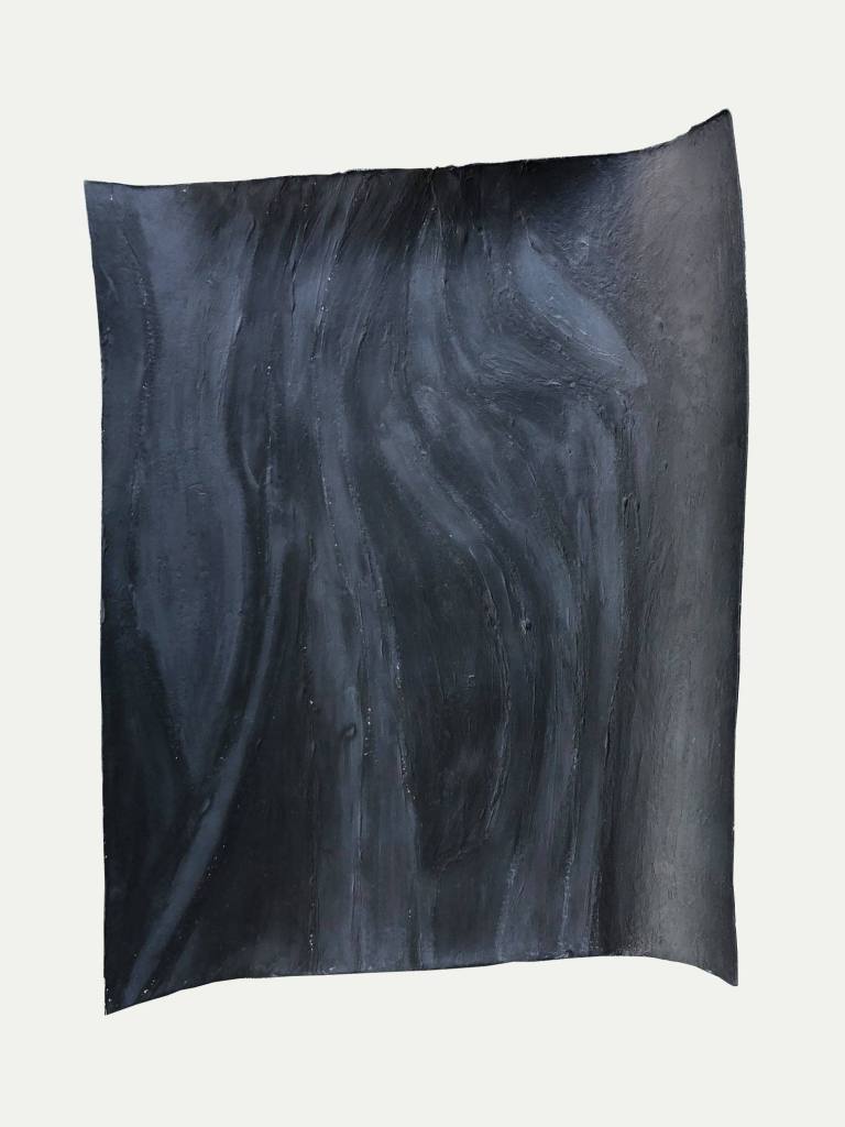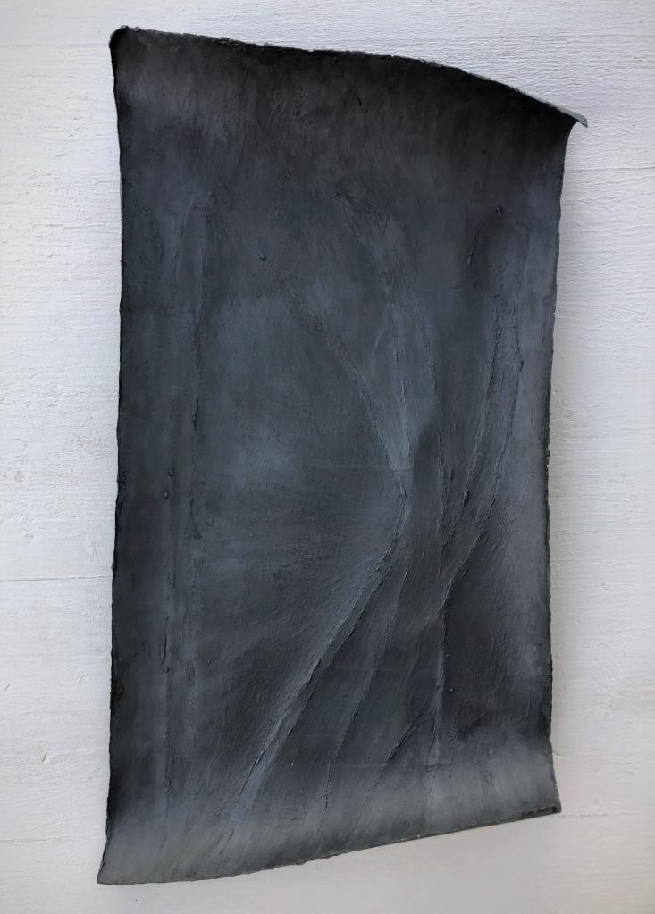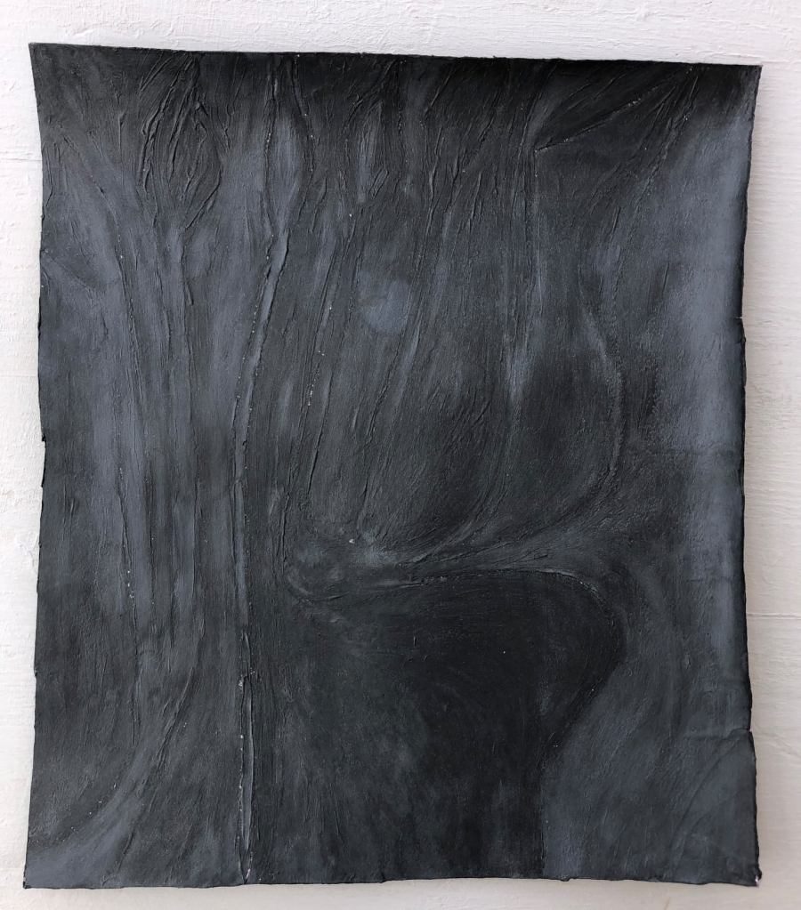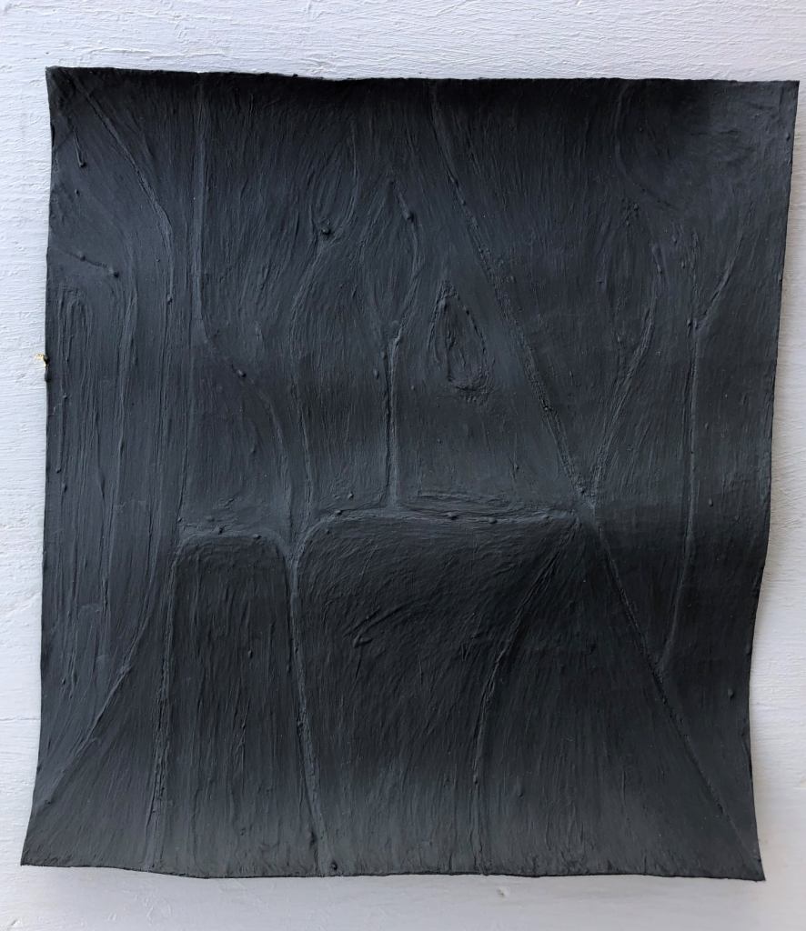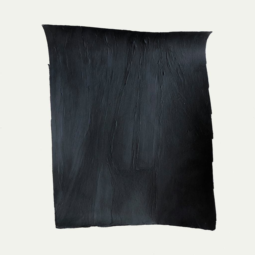 Federico Fusj: All’inizio mi trovavo a lavorare a queste carte dal crepuscolo in avanti, verso la notte che non è l’assenza di luce. Così ho continuato stabilendolo come metodo di lavoro. Creando un ciclo. Essendo quindi lavori fatti di notte o verso la notte, li ho chiamati Notturni. In musica il notturno nasce in forma di monodia e queste possono essere monodie visive. Forse il termine monodia è più calzante di monocromia…. Un canto ad una sola voce, la voce è una materia… A me fanno pensare agli schermi spenti dei cellulari, che diventano pozzi profondi che riflettono le impronte. Questi Notturni riposano lo sguardo. Hanno solo una livrea scura, elegante, anche Hassidica per chi ne conosce il significato.