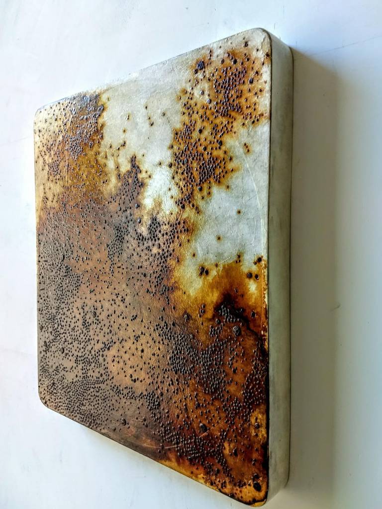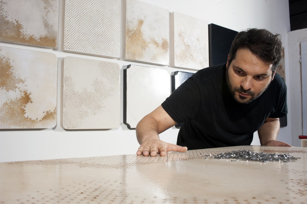 Sebastiano Dammone Sessa: Tutto confluisce inevitabilmente in una sorta di sintesi che scaturisce dal concetto di densità come ad esempio nei primissimi lavori denominati Carta su carta del 2007, dove sentivo proprio l’esigenza, attraverso la sovrapposizione di carte apparentemente banali, di ricavare dei solchi più o meno regolari sulla tavola. Queste superfici, generate dal rapporto di prossimità dei vari fogli di carta (materiale a me caro poiché legato alla mia infanzia), mi fecero immediatamente pensare a delle “mappe” e quindi all’idea del viaggio. Successivamente con il ciclo Appunti, oltre alla dominante cromatica a modo suo sempre presente nel lavoro, ho iniziato a sommare e sagomare la materia smussandola sistematicamente e collocandone il risultato nello spazio; dapprima a terra e poi a parete, cercando sempre una disposizione in grado di rigenerarsi all’infinito, variando semplicemente il rapporto di prossimità dei vari elementi e il loro peso cromatico. Un solo elemento spostato avrebbe rimesso in discussione l’intera composizione e generato nuove soluzioni formali più o meno efficaci. Solo da qualche anno, con la serie Tracce, opere costituite di migliaia di chiodi conficcati nella tavola, sto continuando ad affrontare il rapporto di prossimità tra i vari elementi (operazione che suona tristemente attuale per via del distanziamento sociale che le recenti norme sanitarie ci hanno imposto) e la conseguenza cromatica dell’ossidazione del ferro che mi sforzo di tentare di dominare.