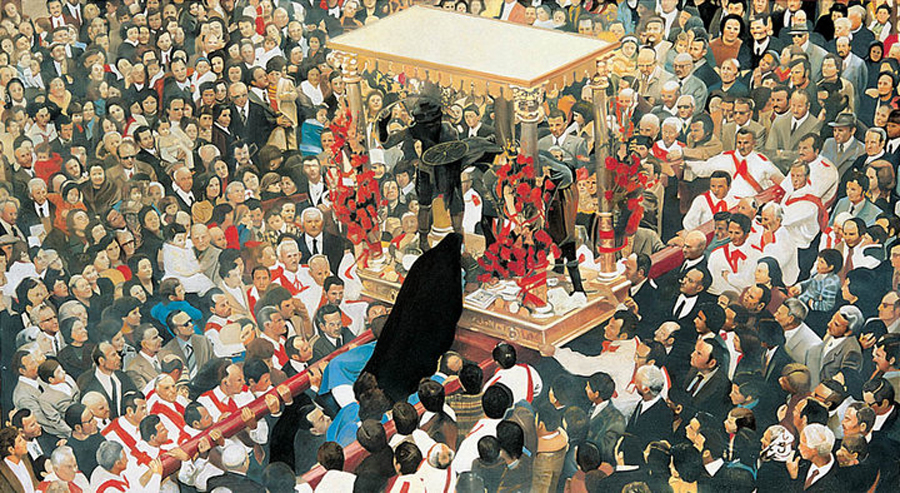 Francesco Lauretta: Uh, in verità sono i “quadri meno dipinti” quelle delle processioni, ma tant’è molti ricordano il mio lavoro delle processioni. Le ultime processioni le ho realizzate per la mostra “Due volte”, due, una piccolissima tela, quasi una miniatura, e una grande che riproduceva la mia prima realizzata, 1998, esposta in “Valori plastici” dal titolo “Idola”, poi “Idola remix” nel 2017. In effetti ne ho realizzata anche un’altra, nel 2020, che però faceva parte di un polittico, stretta da altre 5 tele con cornici bicolore, Le bagnanti, dal titolo “Como siempre”. Quest’ultima, rispetto alle prime, è dipinta in modo differente: non più stressata, super-reale, ma “alterata”: le figure, il santo, uno splendido san Michele, i nastri colorati, sono stati dipinti con colori improbabili, direi ‘esotici’. La percezione della festa così m’è apparsa non tanto prossima al realismo, o alla prossimità della sua immagine ma a qualcosa che ha a che fare con il “festivale”, a colate di gioia. In Valori plastici “Idola” era parte di una installazione che comprendeva due quadri per stanza e ogni stanza aveva un nome, in quel caso “Idola” era assorbita da un altro quadro che riproduceva un attentato a Tel Aviv. Poi sono apparse, le processioni, prepotentemente ne “Le metafisiche”, personale a Milano con due grandi processioni, “Sotteso blu assortito” e “Rosso sciantoso” (2004). Altre sono saltate fuori periodicamente. Dovessi elencarle non credo poi di averne dipinte molte, una all’anno forse ma è evidente che non passano inosservate anche se inizialmente non capivano perché le dipingessi. Dai titoli sopra puoi comprendere che se da un lato mi interessava esporre il rito, dall’altro mi consentiva, dipingere la folla festiva, di pensare alla pittura e al fenomeno della percezione del colore – Rosso sciantoso e Blu assortito, ecc. – come forma “mortale” (ricordo che ero un imbalsamatore) in perenne tensione con la vita ripetibile, tipico delle feste. Più elaboravo l’immagine più l’immagine riusciva imbalsamata, corpo morto in bellavista. Come è naturale oggi rivedo e dipingo le processioni diversamente rispetto a 10, 15 anni fa, e se le dipingo è perché del rito della festa mi interessa il suo processo narrativo, e della sua trasgressione in un mondo equivalente a un conformismo vuoto.