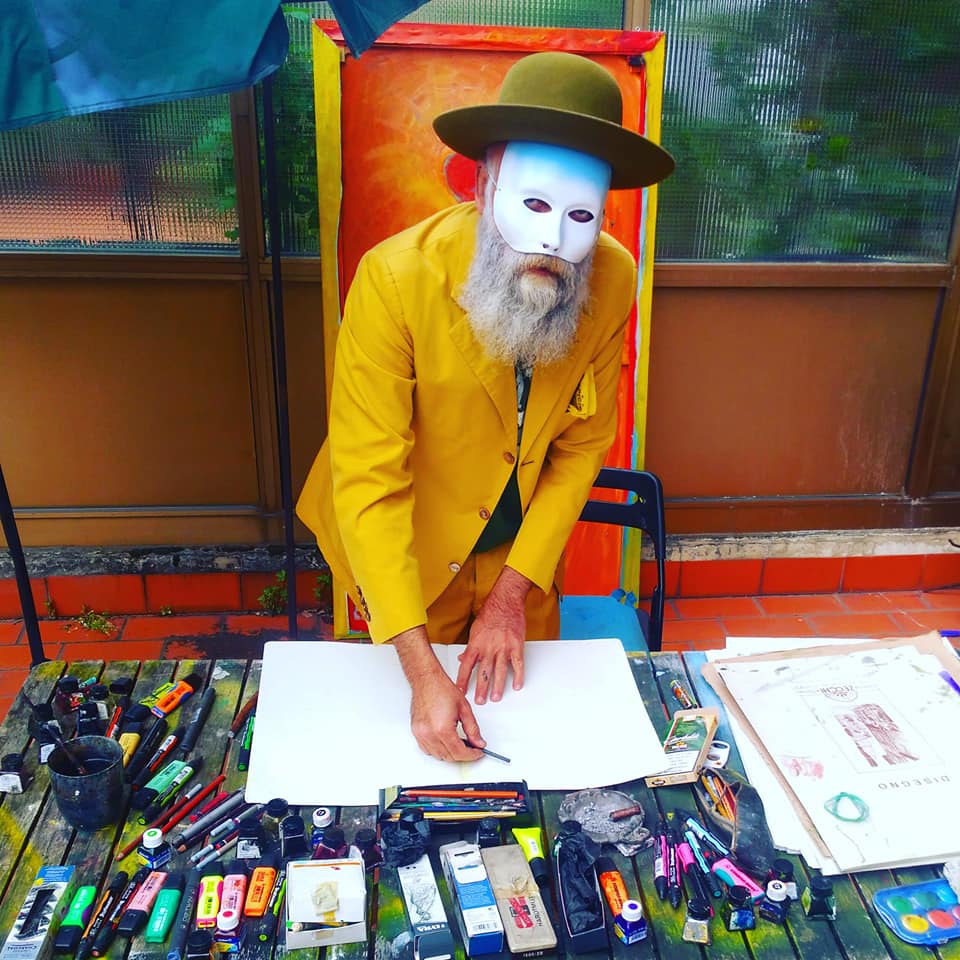 Francesco Lauretta: Quello della maschera è un progetto aperto. Il progetto realista che apre la pista verso parte dell’opera pittorica mi aveva messo nella condizione di esporre una maschera specchiante che consentiva, a chi mi stava difronte, di intravedere e quanto realizzassi in quel momento -maschera indossata spesso durante le “lezioni” della Scuola di Santa Rosa- e di percepire la realtà, e il Reale, in modo sempre ambiguo, difficile da comprendere pienamente. “Las Meninas” di Velázquez è stata la sorgente di quella intuizione che col tempo è cambiata: maschera turchese, dorata, gialla infine per Pasavento, quindi cambiata la ‘postura’ della maschera, e del suo uso. Da sempre il mio corpo è intervenuto intorno alla pittura in modo performativo fino a esserne protagonista nel momento in cui ho compreso che la mia ‘figura’ era diventata, come dire, quasi un’icona, ma anche meme, attraversando le sembianze di san Gerolamo, di Pasavento che, da un paio di anni, ha cominciato ad esporre da solo.