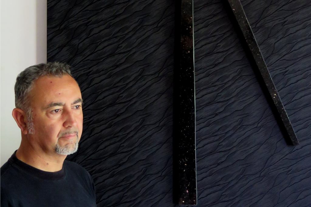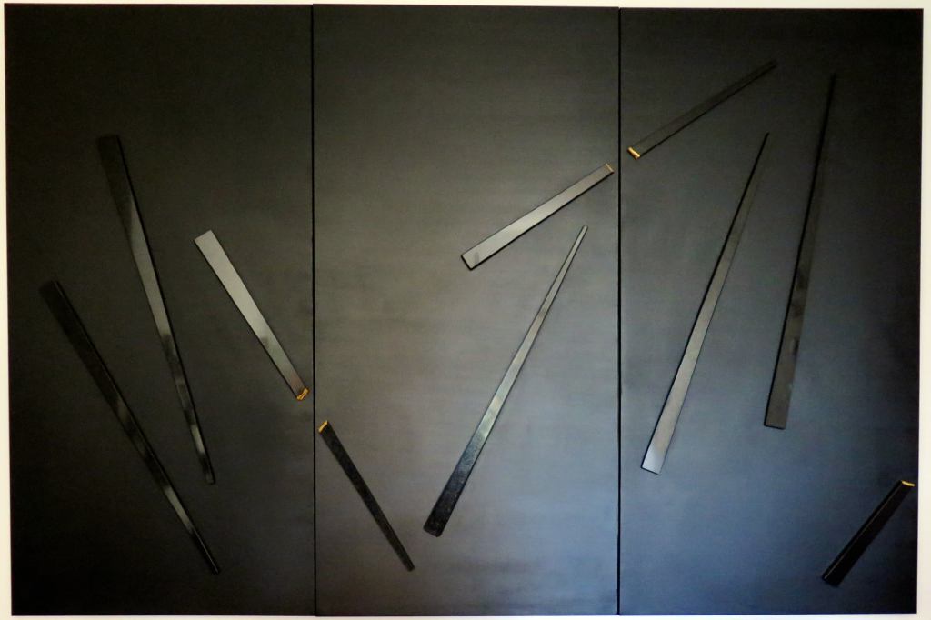 Dancing Bladelight monumentale I, 2020, olio su tela con inserti in granito nero e foglia oro, cm 200x300x7 – Collezione Privata