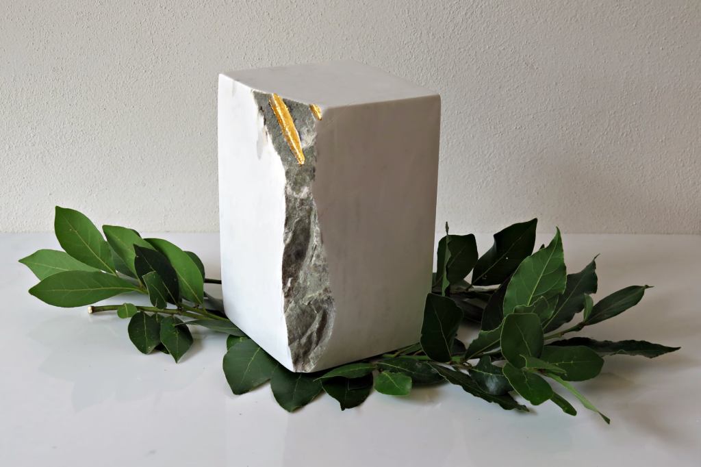 Nocube V – Studio per un monumento al Poeta – , 2020, marmo bianco di Carrara, foglia oro e alloro, cm 22x60x45. Opera x Museo di Montecassino – Abitò con se stesso – Guarneri, Marchegiani, Parra, Rea