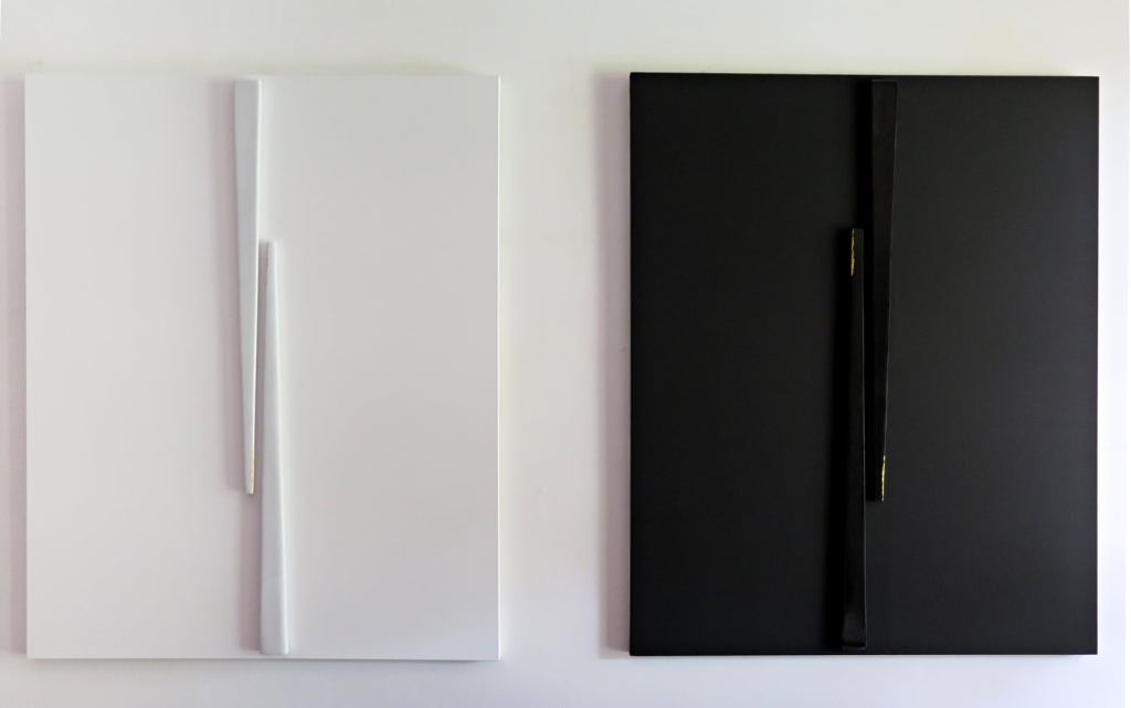 MatterConceptual , 2019, acrilico bianco e marmo Statuario con foglia oro – olio su tela con marmo nero Belgio e foglia oro, cm 120x100x7 cad.