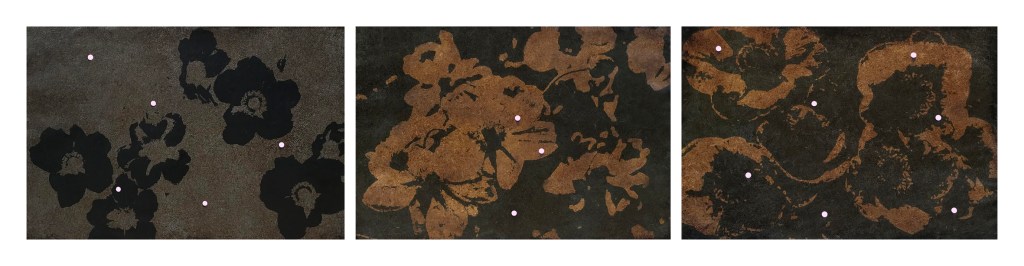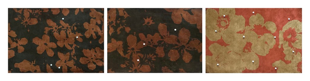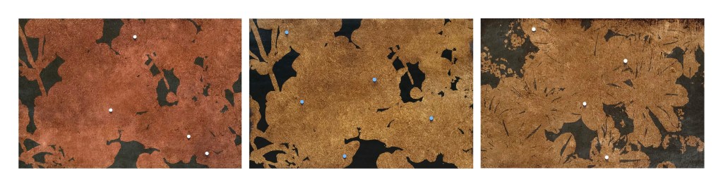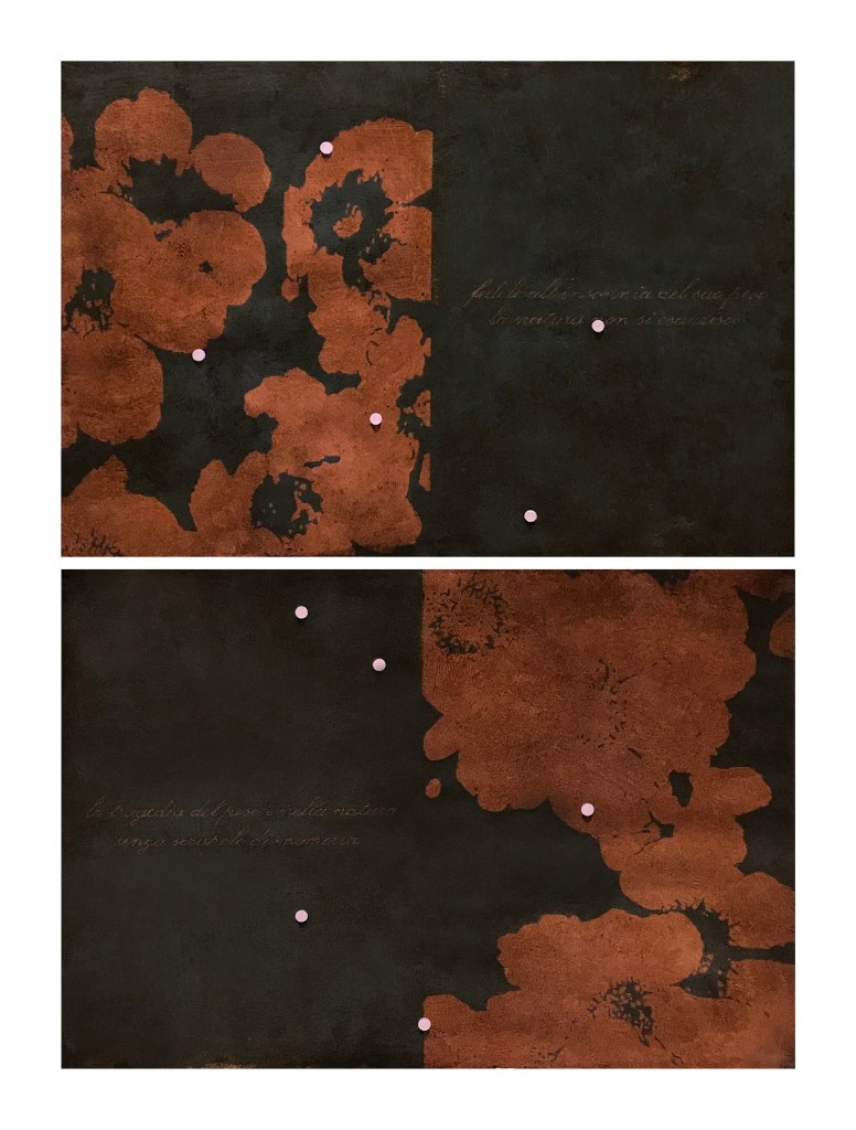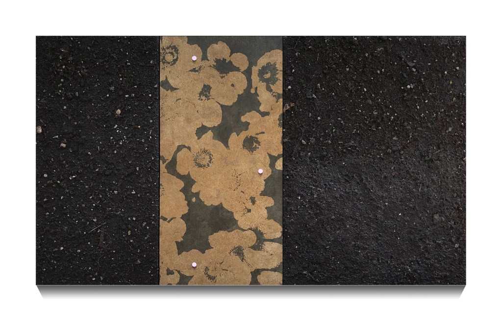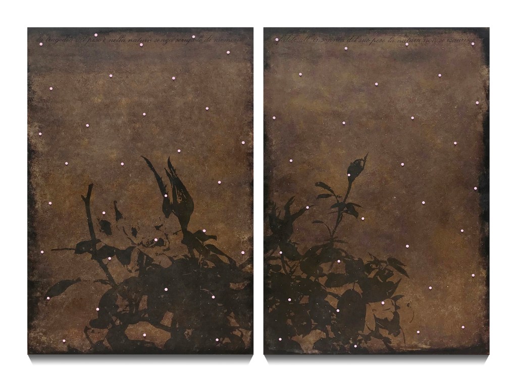 La tragedia del peso (e i quadri sepolti), acrilico, vernice ed elementi naturali su tele, cm 40×70