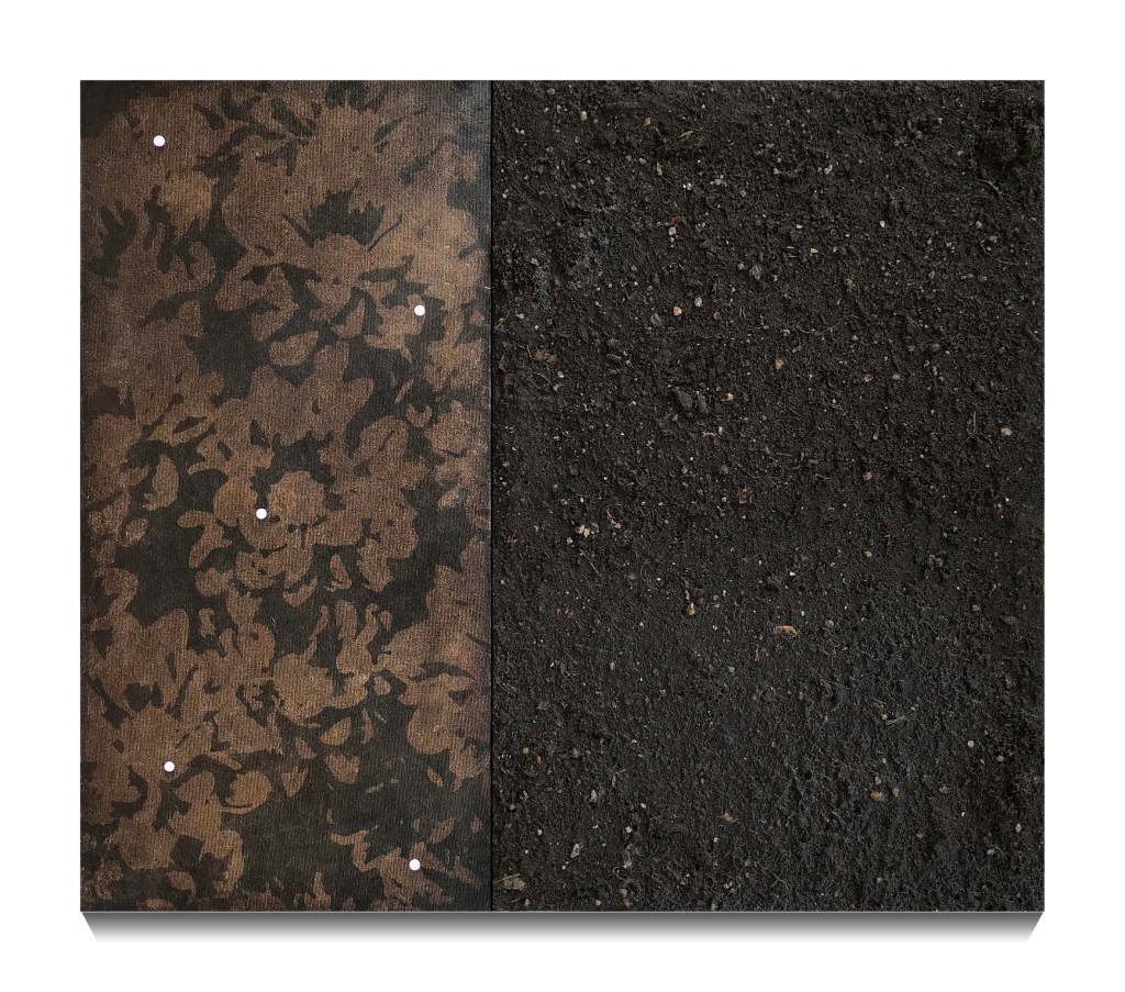 La tragedia del peso (e un quadro sepolto), acrilico vernice ed elementi naturali su tele, cm 60×70