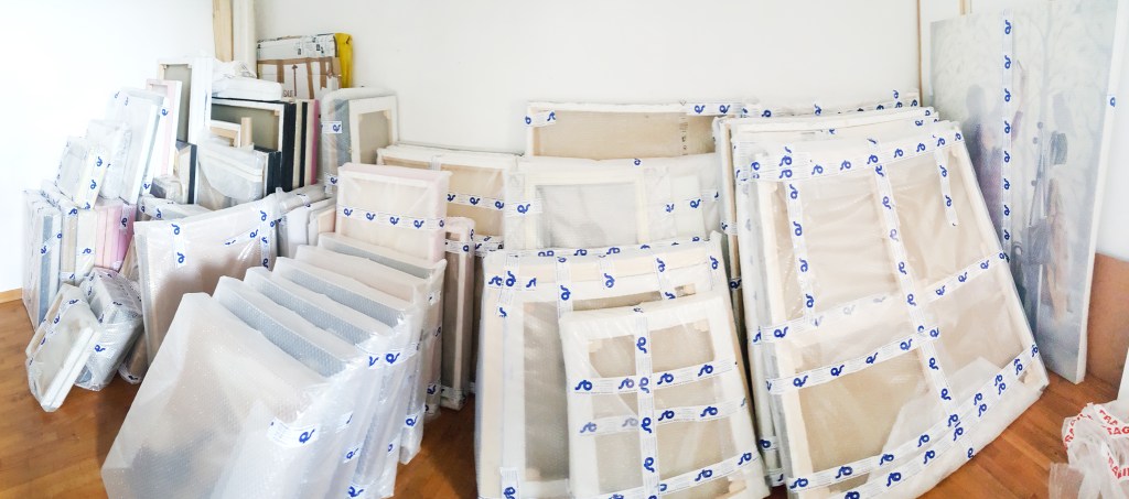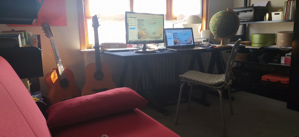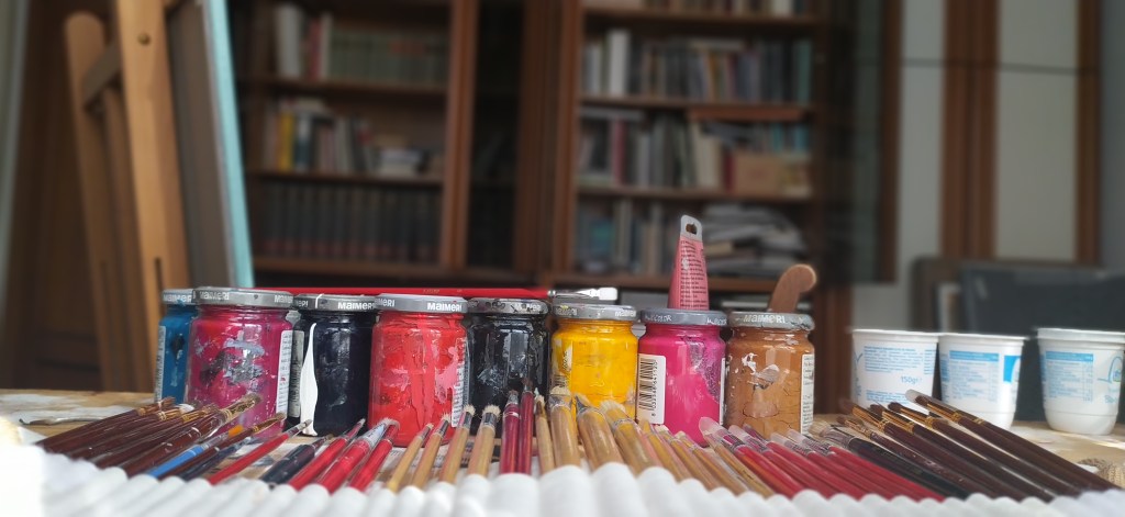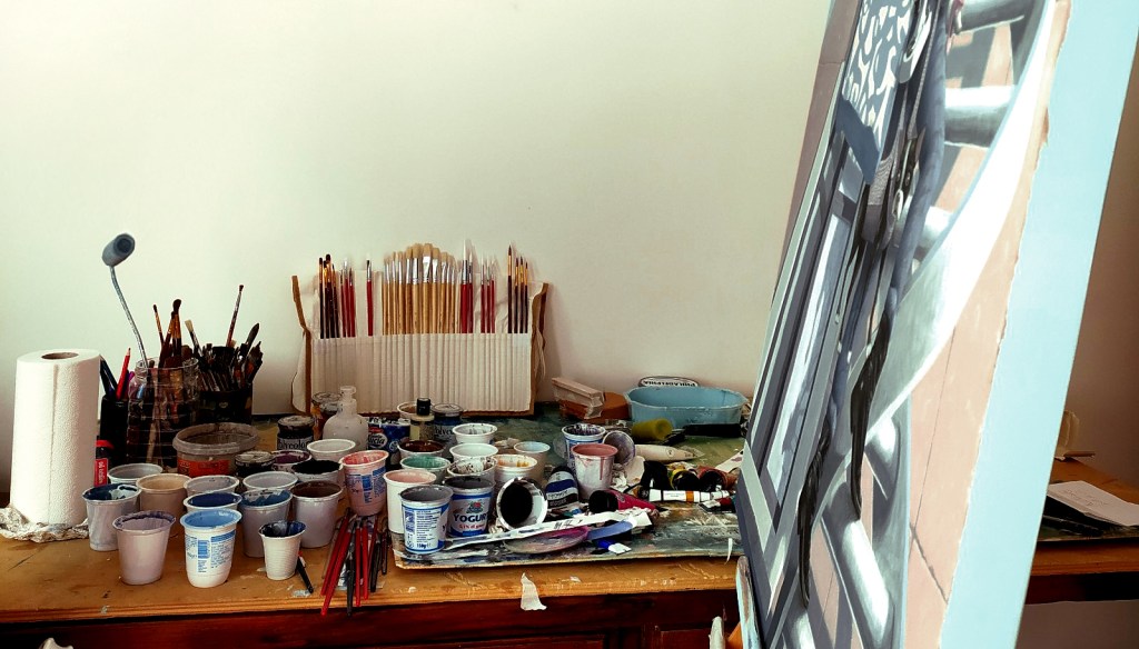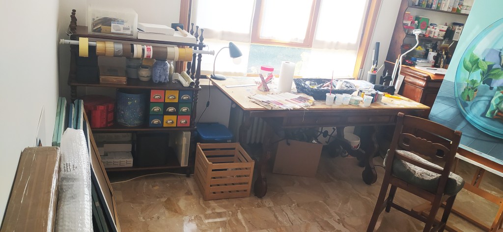 Il mio studio fisico è invece una grande stanza dove ho a disposizione centinaia di libri, un cavalletto, un tavolo di grandi dimensioni e tutti gli strumenti adatti al mio lavoro.