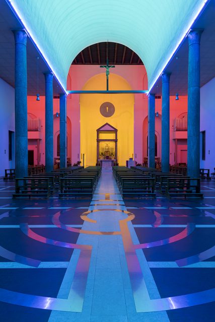 Personalmente, tuttavia, trovo più interessante rintracciare il sacro nel contemporaneo in progetti in cui la committenza religiosa ha dialogato con gli artisti in una formula alla pari, scevra da pregiudizi reciproci. Alcuni luoghi, in particolare, testimoniano come artisti quali Henri Matisse ne la Chapelle du Rosaire a Vence (1951), in Francia, Mark Rothko nella cappella omonima, a Houston, in Texas (1971), Dan Flavin nella Chiesa Rossa a Milano (1996) ed Ettore Spalletti nella Cappella di Villa Serena a Città Sant’Angelo, vicino a Pescara (2016), abbiano realizzato ambienti in cui si respira la spiritualità aldilà del facile ricorso all’oggetto simbolico, attraverso semplici ingredienti come luce, colore, linea e silenzio. Parlando di rapporto con la religione non si può non citare Marc Chagall e la sua vocazione per le vetrate delle cattedrali, di cui il ciclo più noto è quello realizzato per la cattedrale di Reims in Francia nel 1974 e, per associazione, l’intervento di Gerhard Richter per il transetto sud della cattedrale di Colonia in Germania del 2007. Di notevole impatto visivo ed emotivo è anche il progetto di Miquel Barceló per la cappella di Sant Pere nella cattedrale gotica de la Seu a Palma di Maiorca conclusosi nel 2009. Installazioni ambientali di carattere permanente, realizzate in Italia negli ultimi anni, sono infine quella progettata dallo scultore prestato all’architettura Santiago Calatrava nella chiesa di San Gennaro nel Bosco di Capodimonte a Napoli (2021), quella dell’artista Vittorio Corsini per la Cappella dei Priori di Perugia e quella corale del curatore Giacinto di Pietrantonio, che ha invitato 16 artisti a realizzare degli arazzi per la cattedrale di Cosenza, entrambe del 2022. L’auspicio è quello di vedere sempre più artisti contemporanei confrontarsi con il sacro in progetti permanenti perché l’arte, per tornare ad essere vitale, ha urgente bisogno di uscire dal perimetro autoreferenziale in cui è stata confinata dal mercato.