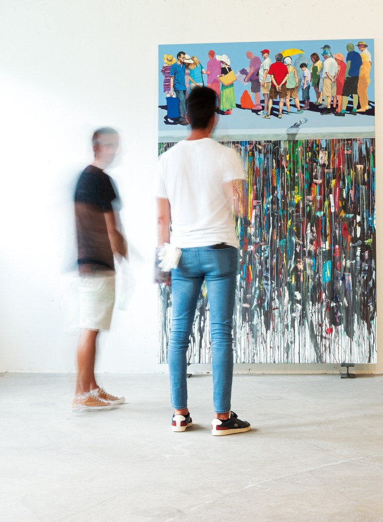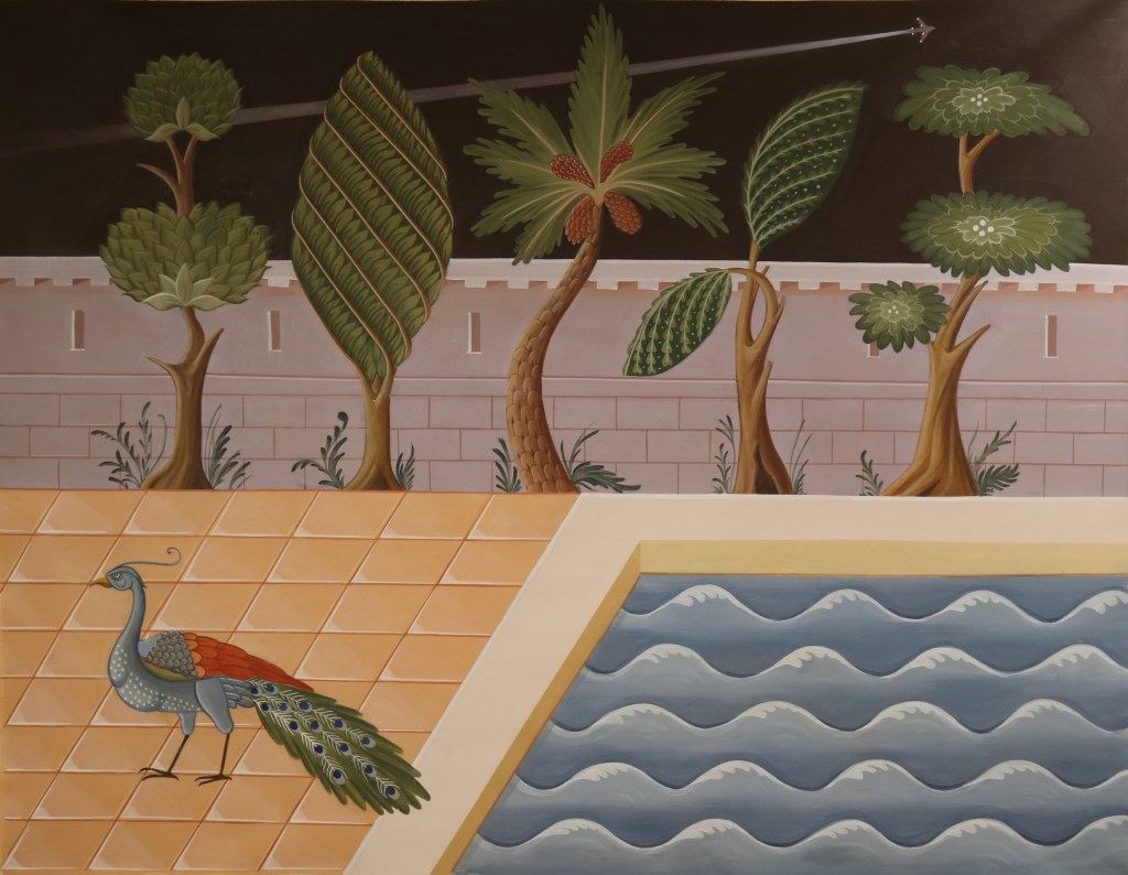Volevo fare il bagno ma c’era un pavone, 2020, pipttura acrilica su tela, 150×200 cm