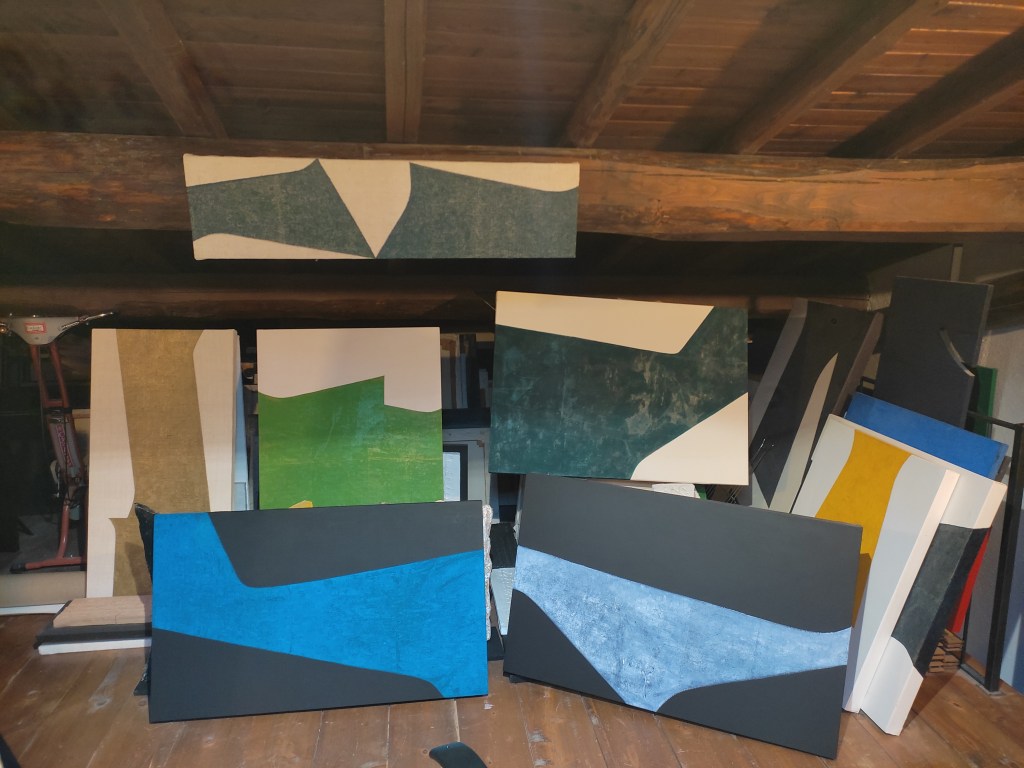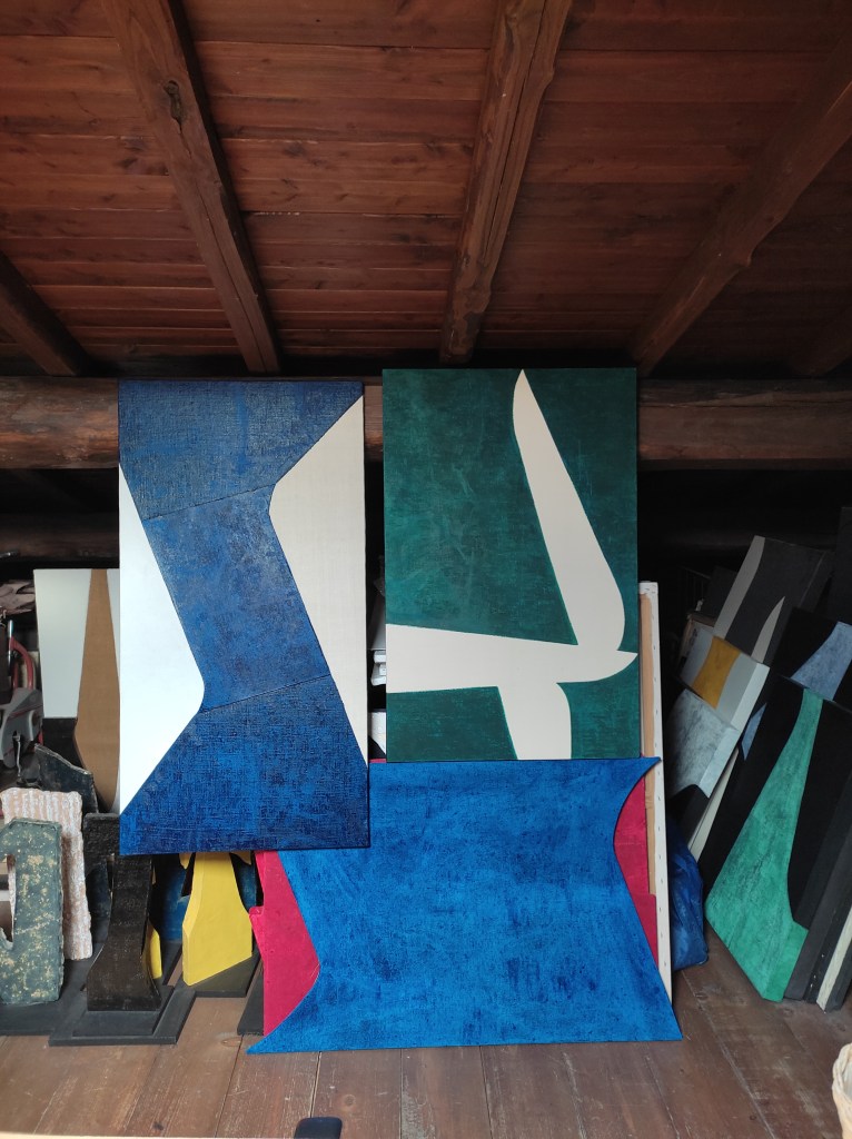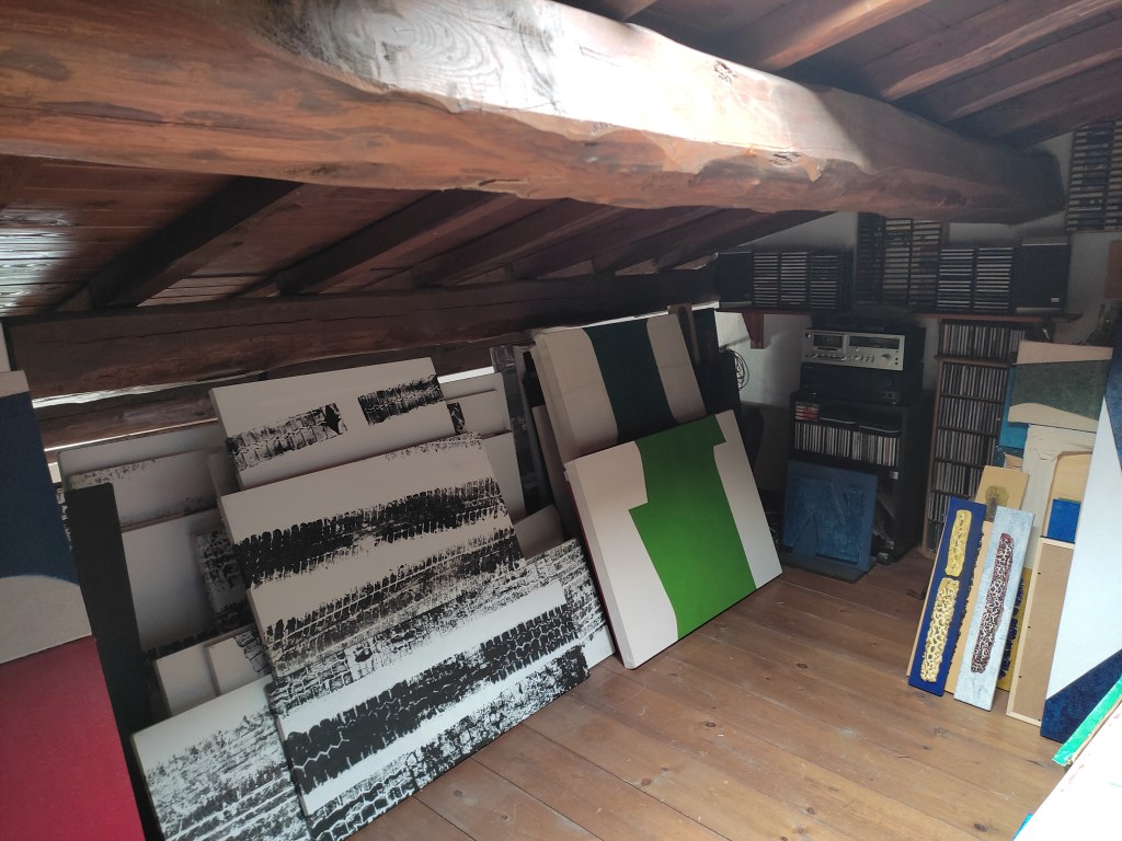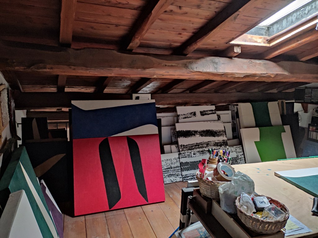 Mi ha sempre affascinato lo studio di un artista. L’ho visto, sin da quando ero ragazzo, come un posto speciale, magico, fatto di odori particolari come quello della trementina, delle vernici, dei colori, di misture e diluizioni, miscugli, colla di coniglio e gesso di Bologna. Insomma un luogo incantato dove, appunto, come per magia, prendevano forma e consistenza e si materializzavano le idee che, insieme ai materiali sopracitati, davano origine alle opere. Ancora oggi mi piace pensarlo così, ed anche il mio studio mantiene questo sapore, queste caratteristiche. L’ho realizzato con un soppalco nella mia casa a Viterbo, nel quartiere-borgo di Pianoscarano, nel centro storico, proprio di fianco alla chiesa romanica, con cripta gotica, di Sant’Andrea. La chiamo casa-studio, l’ho concepita così quando l’ho ristrutturata e ampliata: spazi aperti, intonaco bianco, pavimento in cotto e travi a vista. Si muove su tre piani e, all’ultimo, in alto, c’è il mio studio. In questo posto sono proprio a contatto, le posso anche toccare, con le grandi travi di castagno e le tavole di larice, il suolo con legno di abete e la luce naturale proviene da un lucernario che mi permette di vedere il cielo e, di sera, le stelle! Un ambiente un po’ romantico, come magari è ancora nell’immaginario delle persone ma, come ripeto, vivo nel centro storico della città e questo spazio si inserisce benissimo in tutto il contesto. Quando lavoro mi piace essere avvolto in questo ambiente caldo, in silenzio, circondato dai lavori accatastati, quadri e ceramiche, che sono presenze importanti che hanno stabilito, segnato un percorso che dura, ormai, da più di 40 anni! La musica mi piace ascoltarla quando preparo i telai e le tele, ma quando mi accingo a lavorare sui dipinti, preferisco il silenzio, ho bisogno di concentrazione, di attenzione, qualsiasi altra cosa mi creerebbe distrazione ed io, per lavorare, ho bisogno di serenità, ordine e, appunto, silenzio. Credo che tutto questo si riesce ad evincere dal risultato finale delle mie opere, sempre pervase di equilibrio, compostezza ed essenzialità. Amo stare nello studio perché anche quando non dipingo, mi piace stare qui a scrivere, prendere appunti, usare il computer, pensare, insomma è il mio posto ideale, dove prendono forma le idee e, di conseguenza, questo luogo diventa un libro magico dove raccontare il sogno dell’arte che è il sogno della mia vita.