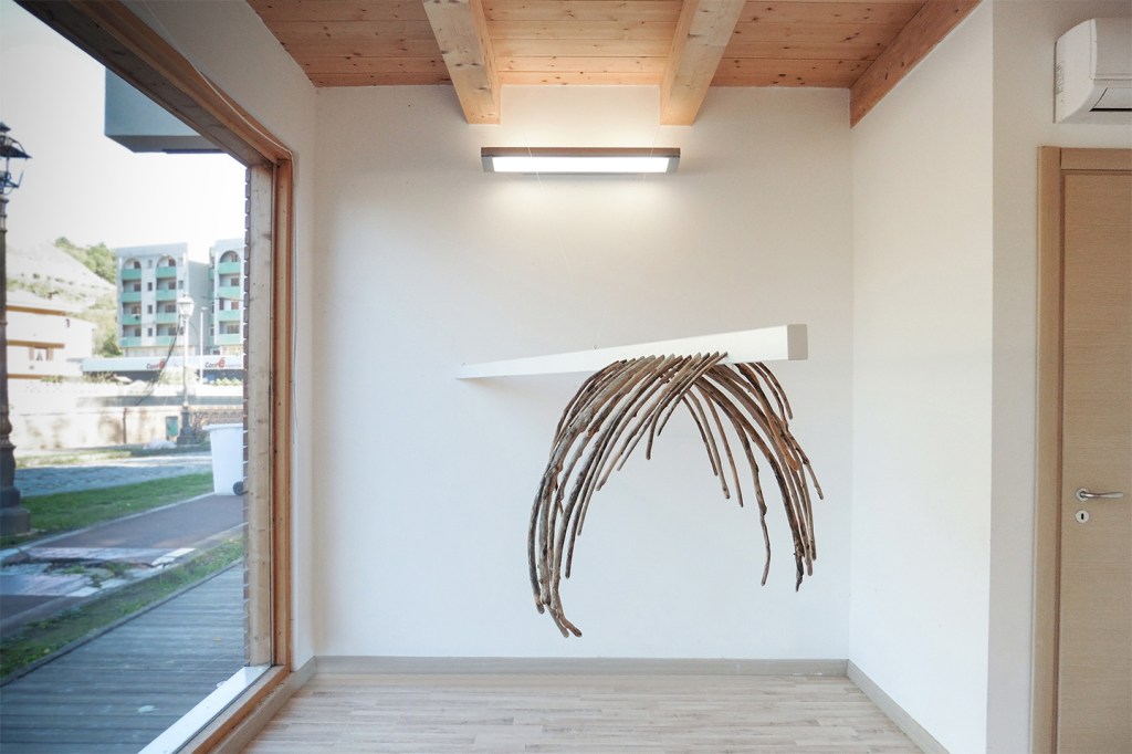 Inserirsi in un processo naturale, nell’azione che la forza della corrente dei fiumi compie su questi arbusti, sradicandoli e trascinandoli a riva, corrompendoli nella loro forma e cromia, non riguarda solo il mero recupero bensì un’interferenza. È come se una diga deviasse questo flusso di materia portandola altrove, sia esso un luogo espositivo, una galleria o un museo. Io conservo le forme scaturite dalla natura, le classifico, le archivio e le utilizzo per creare queste strutture dove i singoli componenti ricoprono un ruolo portante, con il fine di completare questa evasione.