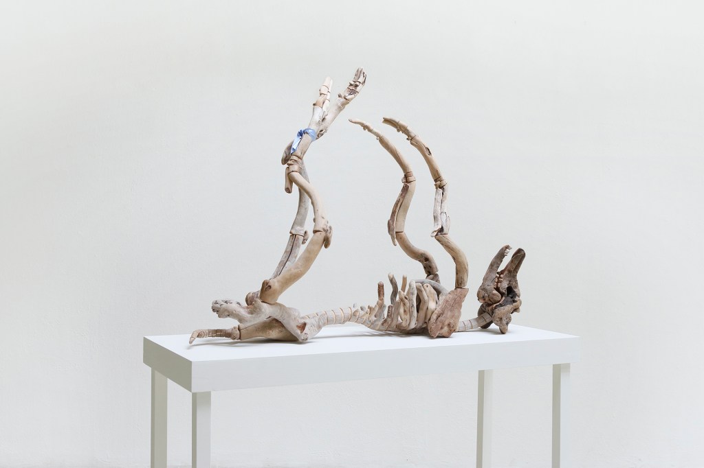 G.L: Di solito parto da un progetto per poi recuperare ciò che mi serve. Gli scheletri sono delle carte d’identità evoluzionistiche, ogni classe porta con sé un patrimonio che si è ottimizzato in milioni di anni, basti pensare alle differenze tra uccelli, anfibi o mammiferi. Sono le loro anatomie ad essersi adattate alla sopravvivenza. Trovo questo aspetto affascinante e sin dall’inizio della mia ricerca ho nutrito un forte interesse per quel tipo di forme mutate dalla necessità. Per me il parallelo con queste radici e rami alla deriva, il cosiddetto driftwood, è stato immediato e mi ha permesso di trasferire altra memoria come quella di un territorio, di un paesaggio, di un’identità, per creare un unico elemento.