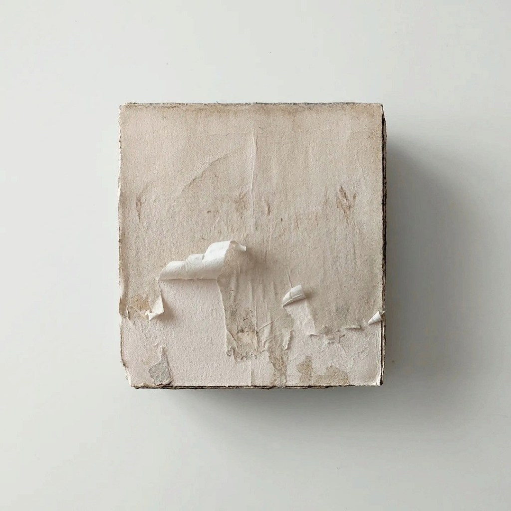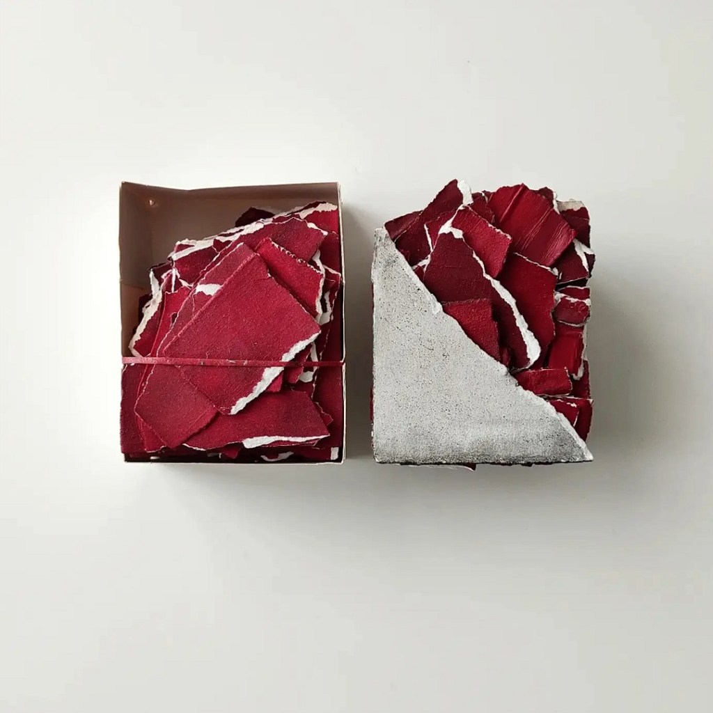Li lascio in luoghi diversi dello studio: alcuni in scatole, altri accumulati su piani di lavoro o sotto un mobile, alla polvere. Altri ancora li metto all’aperto esposti al vento, al sole o alla pioggia: queste pratiche sono fondamentali per ottenere un materiale consumato, deteriorato, lacerato ma che dimostra anche di essere resistente. Il tempo e questi agenti esterni li cambiano, ed è in questo momento che appare la loro storia. Altri frammenti invece sono frutto di un riciclo di avanzi e scarti di miei lavori precedenti.