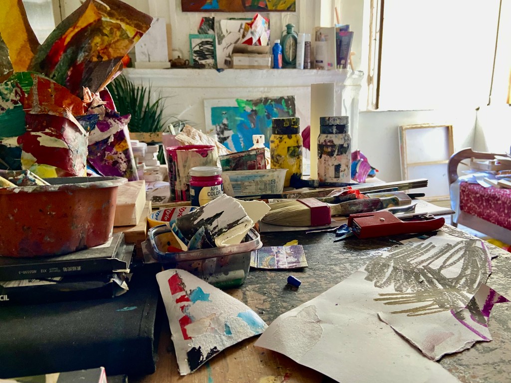 Quindi, quando mi ci reco, di solito ho già qualche idea, qualche progetto in mente che non sempre si rivela “facile” da mettere in pratica, da eseguire. Lo studio, inteso come spazio dedicato alla creatività, mette in atto la “magia”, convoglia tutte le mie forze e la mia attenzione verso l’opera; ogni elemento presente intorno a me all’interno dello studio concorre a completare l’ispirazione necessaria. Lo studio diventa una dimensione a sé stante, dove “strappo” e ricompongo pezzi di realtà secondo la mia interpretazione. È allo stesso tempo contenitore e contenuto; ospita me e tutta la mia visione artistica e contemporaneamente ne è parte integrante.