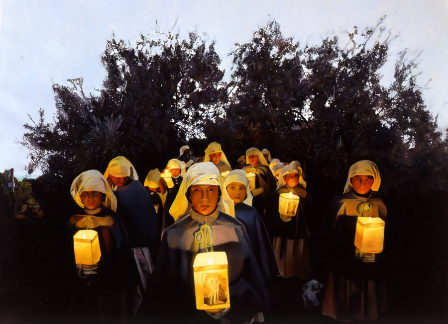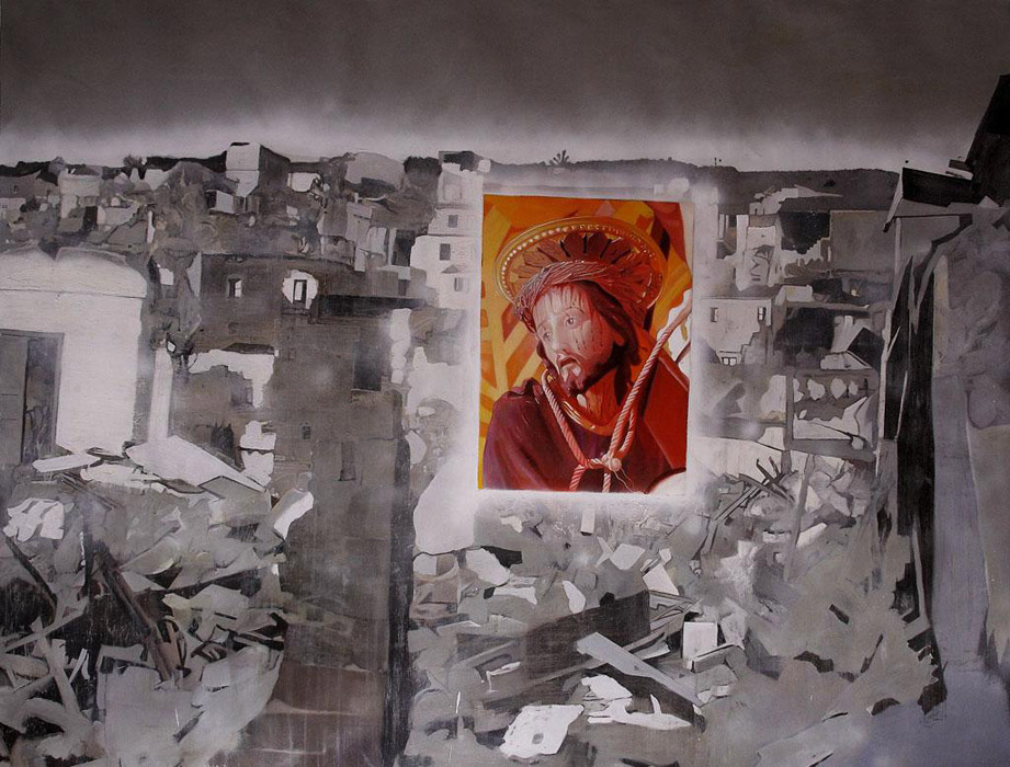 Non è che perché tu dipinga un Cristo flagellato in croce o una natività o una resurrezione quei quadri siano sacri, tutt’altro, spesso sono raccontini inutili. Ernst, per esempio, trovava idiota fare un sogno e dipingerlo per poi dichiarare fosse un’opera Surrealista. Nonostante abbia dipinto Cristi, Madonne piene e morte, processioni, preghierine, resurrezioni e paradisi, non mi ha mai interessato il sacro come tale quanto il fenomeno che si esercita nelle manifestazioni folcloristiche e nelle tradizioni che si svolgono dalle mie parti. Da bambino avevo orrore di quel flagello, Ispica è una cittadina da questo punto di vista ricca e orgogliosa tanto che spesso s’è cresciuti a pane latte e Settimana Santa: un inferno. Come artista proprio non mi interessa lavorare sul sacro. Credo che quando si torna a dipingere croci e Cristi è perché si viva un momento di crisi, e del Sacro ho una mia idea, personale, che vivo intimamente. Bonechi, Salvo Monica, e pochi altri – che ho conosciuto – hanno vissuto disperatamente come credenti. Le Chapel di R o, in musica di F, le Avemarie, poetiche e non, le lascio volentieri agli altri citare. No grazie, del Sacro proprio non può fottermi una benemerita m.: certo è divertente dipingere queste cosine, e facili anche, ma mi annoiano mortalmente.