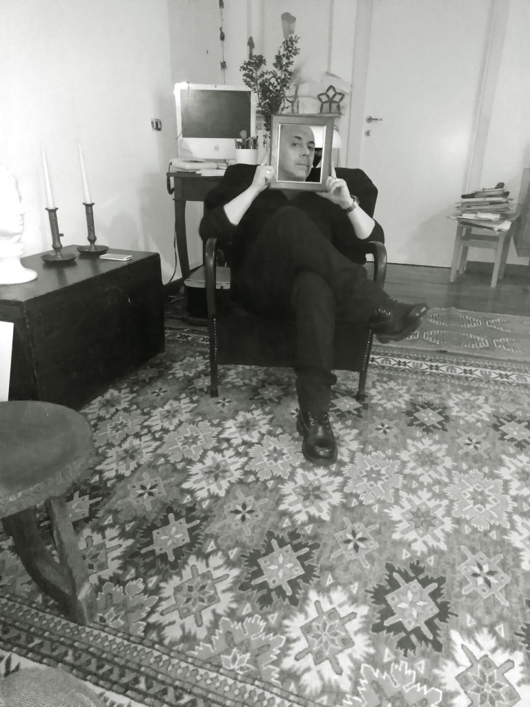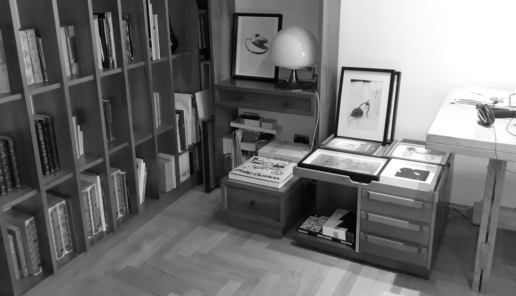 Nello studio c’è anche una libreria con molti libri vecchi di famiglia, libri nuovi e alcuni lavori degli amici artisti. Sono in buona compagnia, non mi lamento. Perché sono un minimalista io (lo dice con autoironia, scherzando).