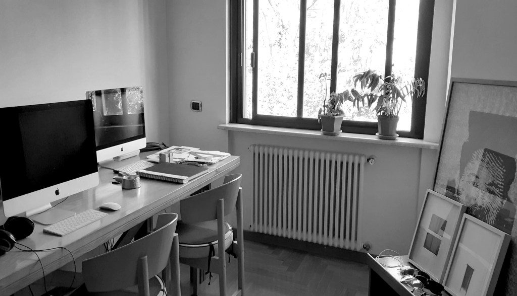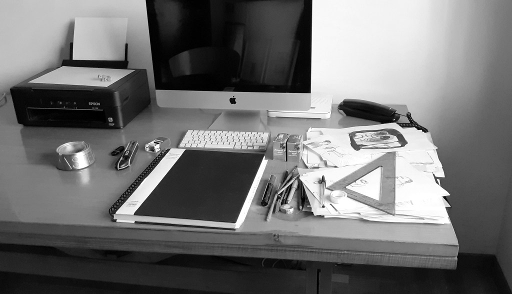 Il mio studio è una stanza dentro casa. La casa è lo studio. Lo studio senza casa intorno non mi funziona. Nello studio c’è il tavolo con i computer per lavorare e la carta e le penne per giocare. Il tavolo si riempie di cose da fare, di disegni mai finiti, di disegni finiti che non mi ricordavo di aver fatto, di oggetti vari, di intenzioni. Si forma una stratificazione temporale da scavo pompeiano. Così mi riduco a fare le cose in uno spazio sempre più risicato. Allora, per allargarmi, ogni tanto uso un tavolino da gita fuori porta e riempio anche quello. Quando ne ho voglia rimetto a posto gli scavi, ma dura poco. C’è vita quindi, sul tavolo. Io sono il tavolo.