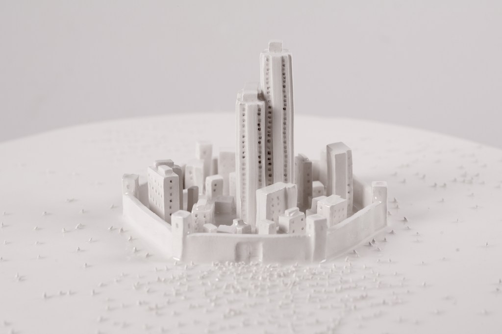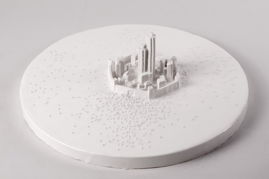 Le rovine, i segni e le tracce delle civiltà che ci hanno preceduto mi hanno sempre affascinato, percepirne la grandezza, lo sviluppo e l’inevitabile decadimento per me è molto affascinante, ci ricorda che nonostante la potenza, la grandezza e le conoscenze tecniche avanzate, tutte le civilltà del passato sono decadute, per periodi lunghissimi dimenticate, e successivamente riscoperte. Un passaggio inevitabile e inesorabile, che si ripete da sempre e per sempre si ripeterà. Sono molto appassionato di letteratura fantascientifica e di cinematrografia, e mi ha sempre colpito come l’uomo sia riuscito a modificare e a evolversi sul lato filosofico e tecnico in così breve tempo, un tempo infinitesimale rispetto alle ere geologiche e ad altri abitanti della terra che ci hanno preceduto come i dinosauri vissuti per milioni di anni. Dal 2019 a ora sono nati altri lavori riguardo al tempo, “Living remains I e II, un opera in continua evoluzione, in cemento grigio, edifici dove quotidianamente e incessantemente cadono gocce d’acqua. Nel corso del tempo il muschio ha ricoperto gli edifici, un lavoro in continua mutazione fatto di muschio, acqua, cemento e tempo (opera esposta a Roma alla Galleria 28, Piazza di Pietra durante la mostra dei finalisti di Malamegi Prize Lab 19). Un ultimo lavoro che vorrei citare sono le “Clessidre”, lavoro sempre in ceramica dove piccoli soggetti architettonici o modelli in scala di automobili si presentano nel loro momento di massimo splendore, ma capovolgendole come una clessidra, il lato sottostante ci mostra lo stesso soggetto ma mutato e consumato dal passaggio del tempo.