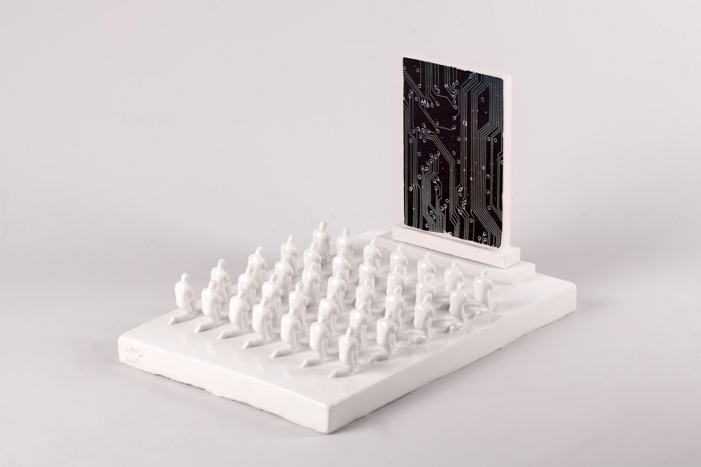 His research focuses on ceramics with which he models contemporary portraits, dystopian worlds, nightmares and contradictions of today’s society. His imagery draws on science fiction from both film and literature and ancient art. His work investigates the passage of time, the decay of things, and man’s relationship with natural and artificial spaces.