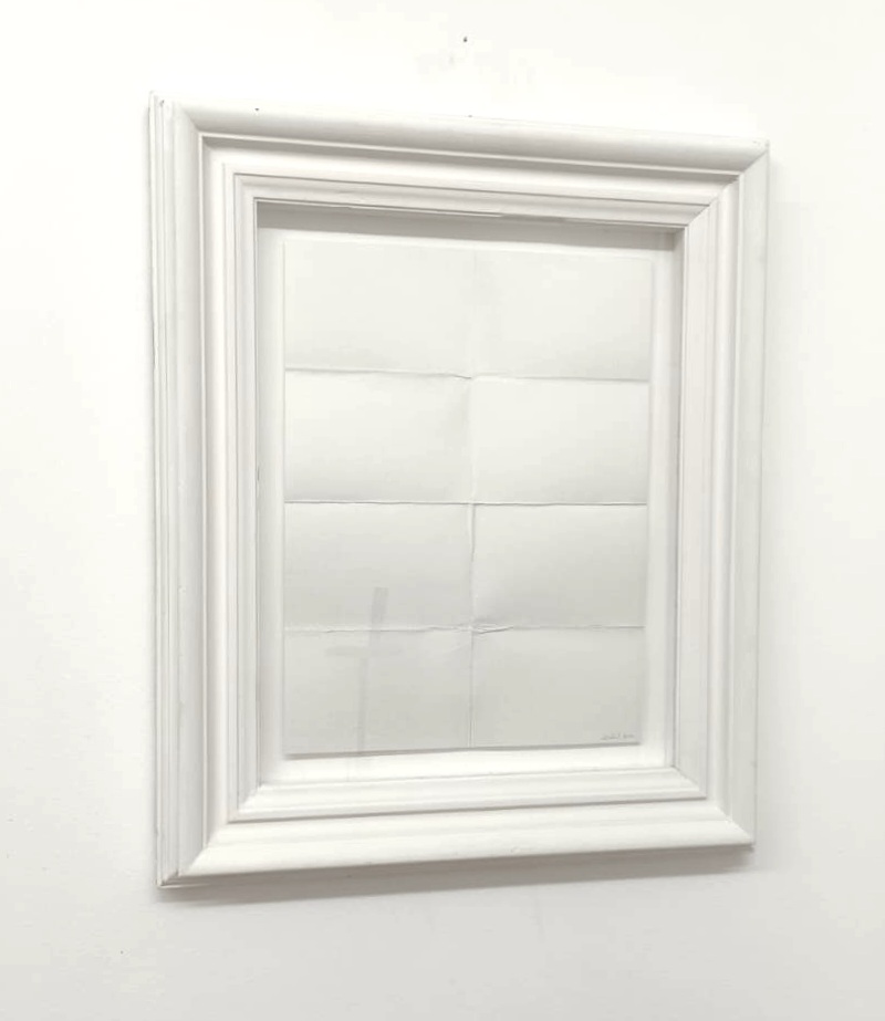 Saverio Mercati: Through increasingly advanced image reproduction techniques, the subject defined as ‘content’ is constantly represented and smeared on all kinds of media. Public or private screens transmit the everywhere, protagonists of an increasingly intercepted, minutely descriptive and superhuman present. Photographed folded papers reflect on a topicality that has already exhausted its exclusive subject. The global and robotic vision, provided by technologies capable of invasive and capillary depiction, produce a continuous propagation of images where everything becomes a subject but nothing really is any more. The folded papers call for photography to be brought to a point of no return, forcing it to a highly significant ‘nothingness’. The paper, the container of the ‘non-image’ photographically represents only what has happened to itself previously, without any other expressive intention. Aware, as we said, that any depiction of the present is in vain, or in any case already produced by image-acquisition tools that continually generate consultable memory. The photograph, in this case, the printed and folded work, amalgamates with what happened to the “container” subject It repeats in the paper the same physical experience of the gesture that generated it; normalising itself to it in a rediscovered interpolation of light and shadow. This generates an interdisciplinarity between photography and bas-relief that makes the work unique, because depending on its location it will always be different, and as the light it encounters changes, it will always be changeable and performative.