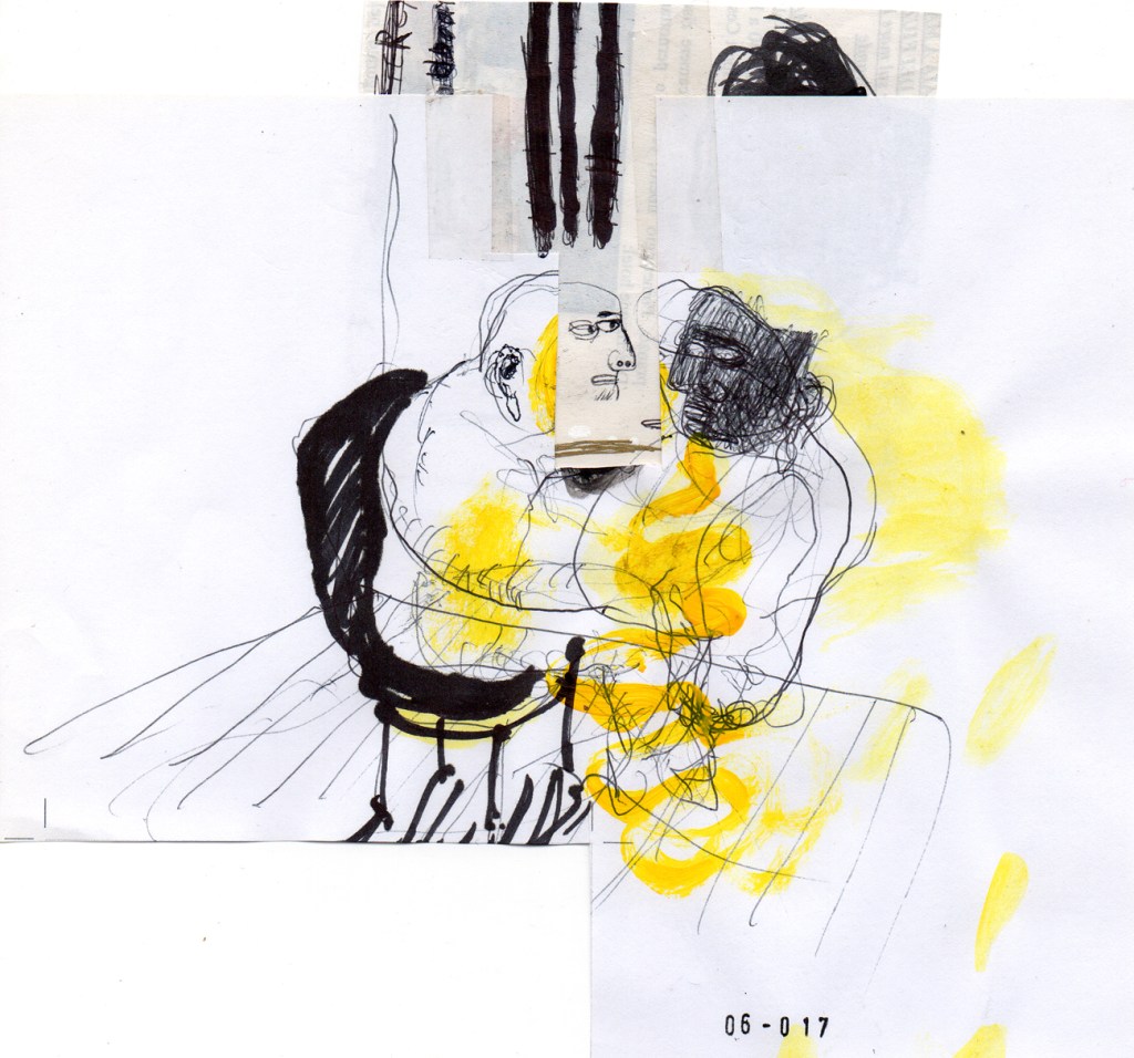 Più spesso invece, inizio con una figura (per me tutto parte dalla figura umana), poi a mano a mano capisco come andare avanti, oppure mi fermo direttamente lì, decido che va bene. Ultimamente mi affido sempre di più al caso, sperando di fare qualcosa di diverso, ma più che altro mi vengono fuori delle cose senza senso. Non lo so, forse il senso sta proprio nel nonsense, oppure nel caos, nel vuoto metafisico, in questa sorta di teatro dell’assurdo che si autogenera…