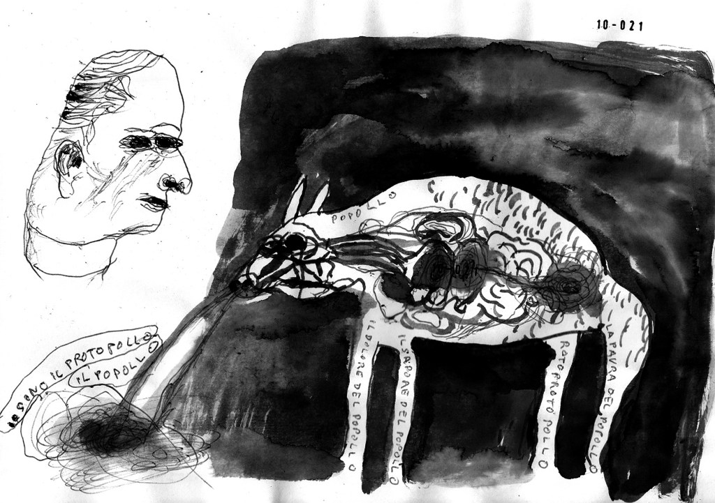 Tuttavia, nei miei disegni, spesso associo alle figure numerazioni o scrittura (senza un vero sistema), che conferiscono al tutto una sembianza di schema, di tavola scientifica, di “figura” da libro. Questo è anche un sistema per “raffreddare” i miei disegni, che spesso sono un po’ crudeli, tragici e buffoneschi. Allora, in questo senso, si può trovare un punto di contatto tra disegno e grafica.