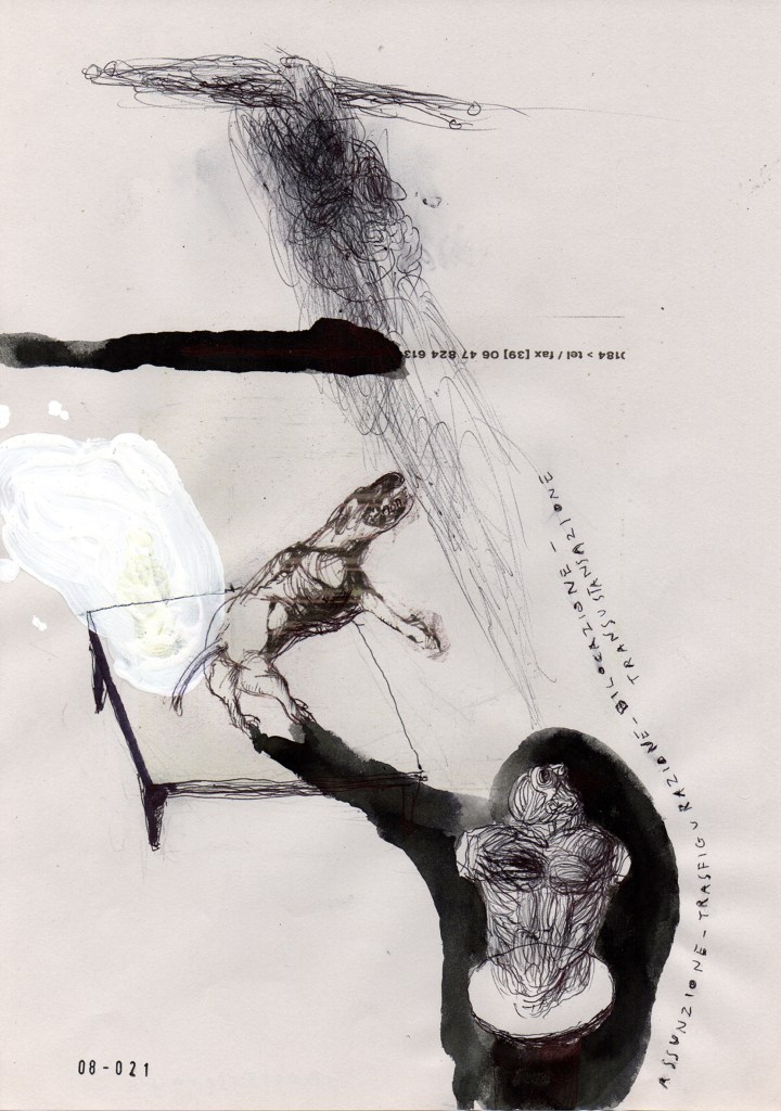 More often, however, I start with a figure (for me everything starts with the human figure), then as I go along I figure out how to go forward, or I stop right there, I decide it’s okay. Lately I’ve been relying more and more on chance, hoping to do something different, but mostly I come up with nonsense. I don’t know, maybe the sense really lies in the nonsense, or in the chaos, in the metaphysical vacuum, in this sort of self-generating theater of the absurd….