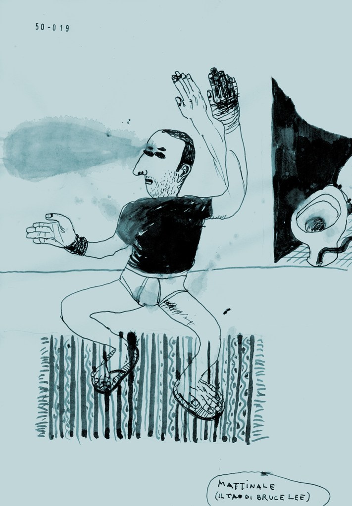 R.G.: La penna a biro è sempre a portata di mano. Se mi viene in mente una cosa, un’idea, uno scarabocchio, prendo la penna e butto giù velocemente. Poi magari mi fermo, dopo un po’ riguardo, riprendo la penna e qualcosa viene fuori. Per me il senso è molto legato all’estemporaneità e la biro, nella sua semplicità, questo me lo permette. Va anche detto che sono un pigro, dunque semplifico le cose. Potrei usare la matita, ma alla fine è troppo “artistica”, la biro è basica, diretta, comune, e non si può cancellare. Per cui gli errori che vengono fuori restano, (sappiamo come l’incidente in arte sia sempre auspicabile, non si sa dove ti porta, si possono scoprire delle cose). Il fatto di non cancellare, alla fine, è una cosa legata all’onestà credo, al tentativo di essere veri. Naturalmente, oltre alla biro, uso pennello e inchiostro o qualche tempera. Per sbrigarmi anche il caffè e la salsa di soia, insomma quello che trovo al momento. Ma queste cose per me sono già sovrastruttura…