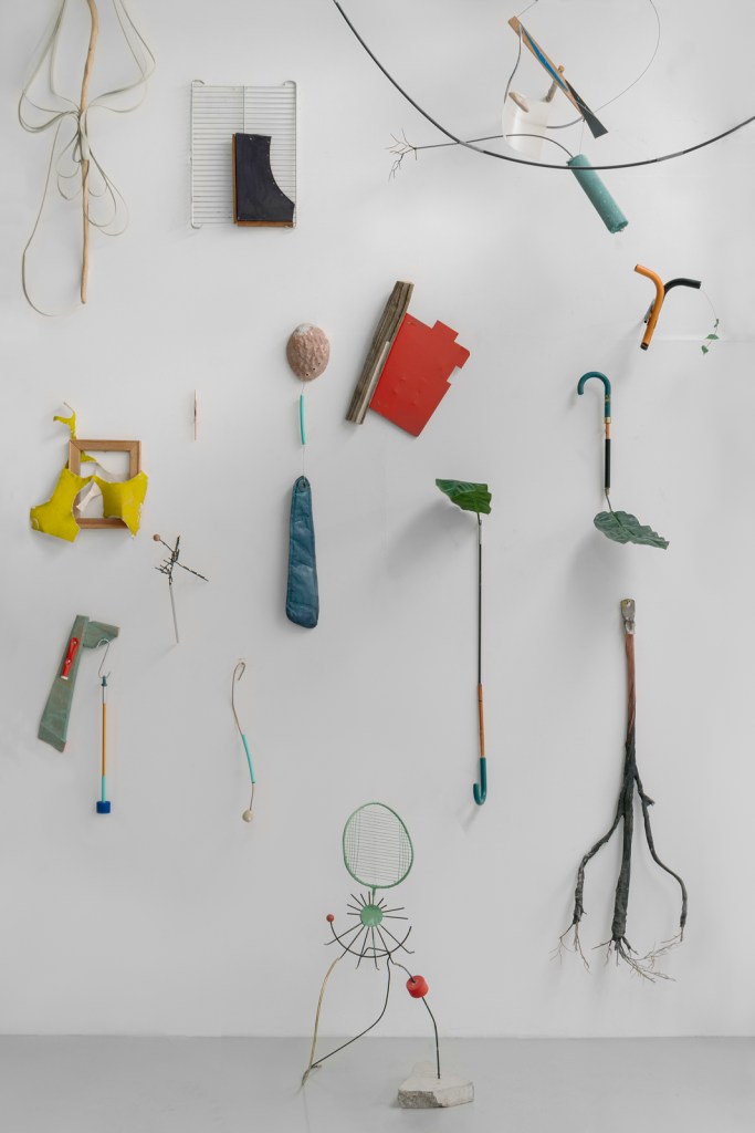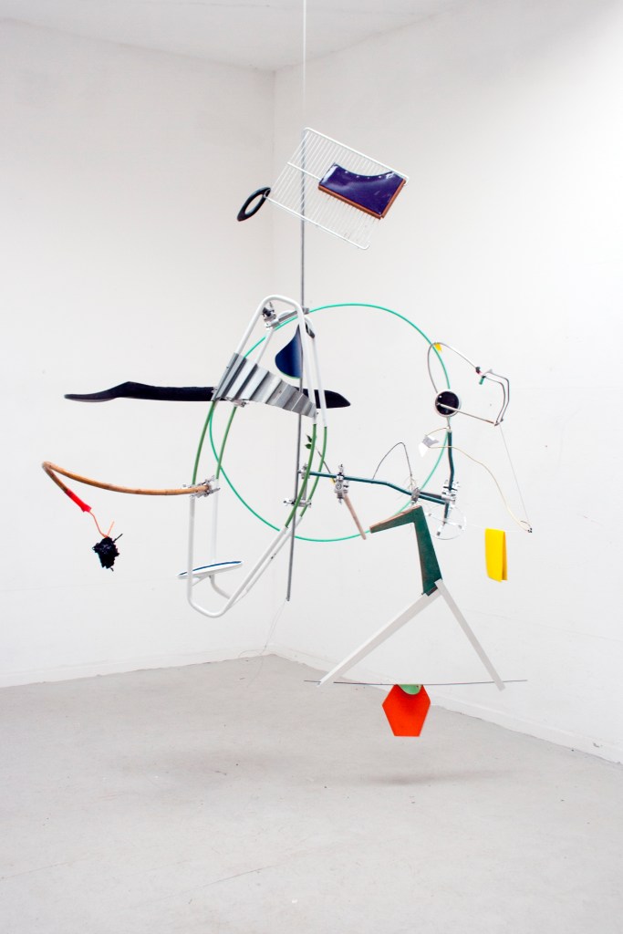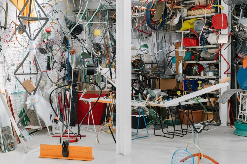 Lavorare con pezzi tridimensionali sottolinea l’importanza dell’impegno fisico. Una fotografia non può mai racchiudere completamente l’essenza di un’opera; per apprezzare veramente le sculture e le installazioni che creo, bisogna viverle in prima persona. Tuttavia, credo che la foto di accompagnamento possa fornire un’impressione iniziale a chi visita il mio studio. Scattata dalla fotografa Giorgia Di Tria circa un anno fa, la foto può inizialmente apparire caotica. Tuttavia, con il tempo, si inizierà a scorgere una certa struttura di fondo. È importante notare che il mio studio è in continua evoluzione, proprio come un processo organico. Un’ispezione più attenta rivela la mia particolare tavolozza di colori all’interno delle scaffalature di vari materiali e oggetti. Alcuni oggetti sono disposti ordinatamente, mentre altri pendono dal soffitto. Verso il fondo dello studio, si trova un’area di stoccaggio dove i lavori più vecchi sono accuratamente imballati. Lo spazio anteriore, invece, presenta una combinazione di elementi scultorei, lavori in corso e oggetti vari che entrano a far parte delle mie installazioni. Questi elementi possono stare da soli o servire come componenti per opere più grandi. Gli oggetti trovati, spesso banali come sedie o attrezzi da giardino, costituiscono i materiali principali con cui lavoro. Riutilizzandoli, creo disegni spaziali che trascendono il loro scopo originario. Spogliati della loro funzionalità iniziale, questi oggetti non solo acquisiscono nuovi significati, ma diventano anche parte integrante del mio metodo di lavoro.