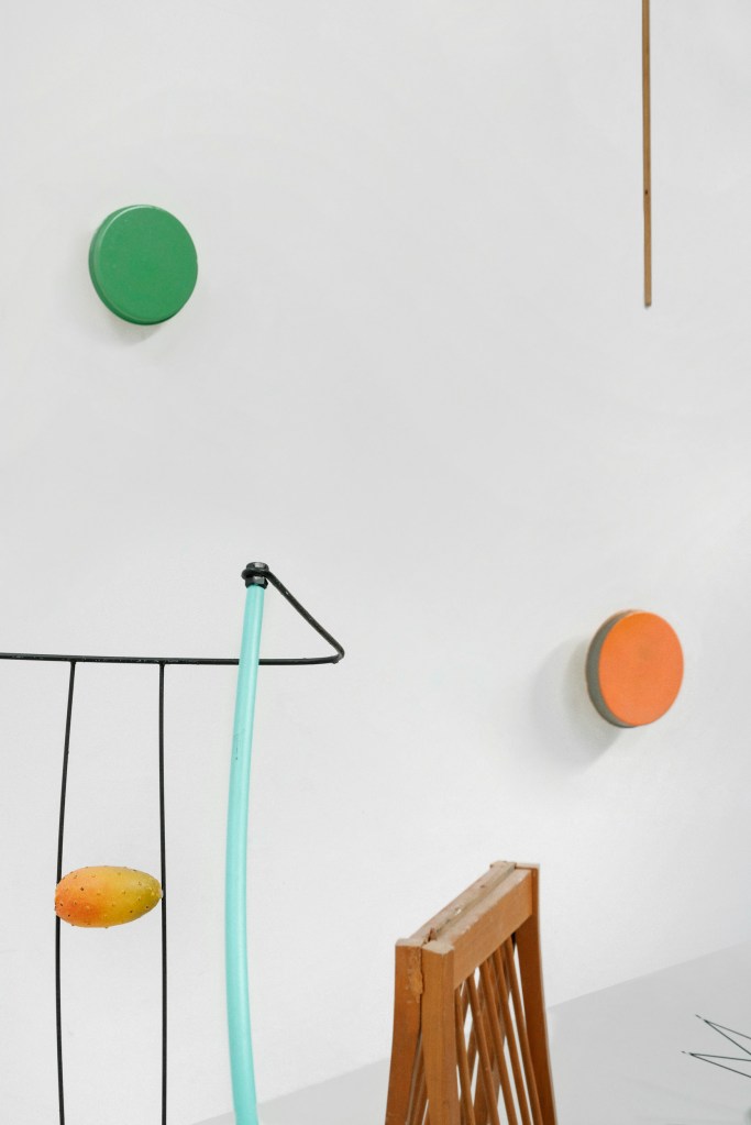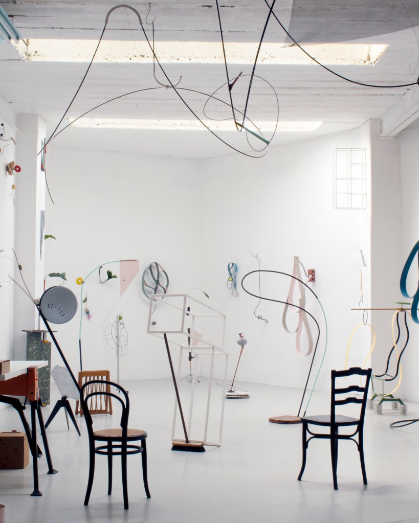 Working with three-dimensional pieces emphasizes the importance of physical engagement. A photograph can never fully encapsulate the essence of a work; to truly appreciate the sculptures and installations I create; one must experience them firsthand. However, I believe that the accompanying photo can provide an initial impression for those visiting my studio. Captured by photographer Giorgia Di Tria about a year ago, the photo may initially appear chaotic. However, with time, you will begin to discern a certain underlying structure. It is important to note that my studio is continually evolving, much like an organic process. Closer inspection reveals my distinctive color palette within the racks of various materials and objects. Some items are neatly arranged, while others dangle from the ceiling. Towards the back of the studio, you will find a storage area where older works are carefully packed away. In contrast, the front space showcases a combination of sculptural elements, works in progress, and miscellaneous objects that find their way into my installations. These elements can either stand alone or serve as components for larger works. Found objects, often mundane items like chairs or garden tools, constitute the primary materials I work with. By repurposing them, I create spatial drawings that transcend their original purpose. Stripped of their initial functionality, these objects not only acquire new meanings but also become integral to my working method.