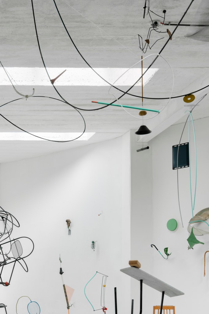 In the next photos, you can see another area within my studio, offering an alternate perspective. Here, the space appears less chaotic, primarily due to the corner with white walls. This corner holds significant importance for me. I try to remain it clean and empty, serving as a space for assessment and evaluation. It is here that I also photograph pieces, enabling introspection and critical analysis of each new creation. In essence, my studio is as much about arranging and organizing as it is about the artistic process itself. Before any exhibition, I like to conduct a test setup considering the specific environment where it will be showcased. Light, space, surroundings, and focus are crucial elements that contribute to the creation of each “demountable spatial drawing.” This process allows for the incorporation of chance, interaction, and context in defining every presentation. Found objects serve as my primary materials – ordinary, everyday things like chairs or garden tools – but through the removal of their original function, they are transformed into “demountable spatial drawings” that are adaptable and specific to each site.