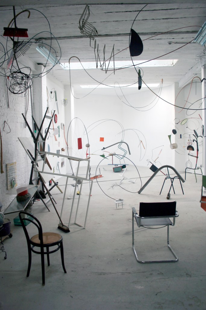 oggetti ordinari e quotidiani come sedie o attrezzi da giardino, ma attraverso la rimozione della loro funzione originaria vengono trasformati in “disegni spaziali smontabili”, adattabili e specifici per ogni luogo.