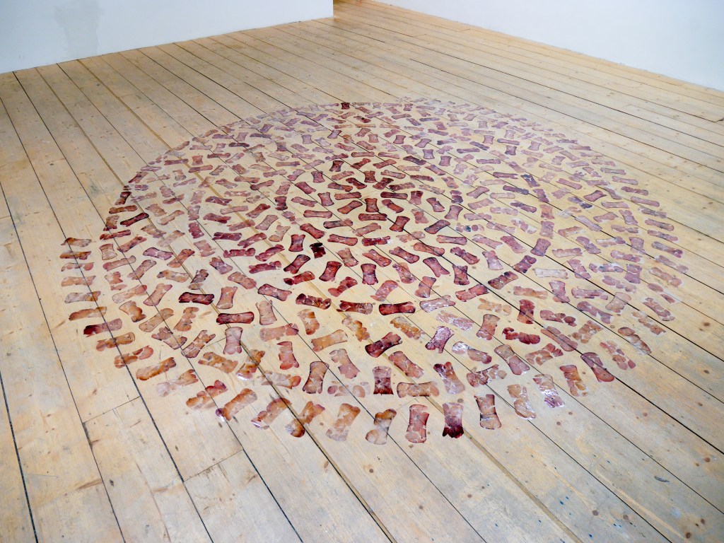 La consistenza della terra cruda e liscia mi portò a inserire un altro elemento al lavoro: una pelle di mucca, che appesa al muro ripropone le forme delle sculture attraverso la loro assenza e con una leggera deformazione data dalla natura del materiale. Le forme in pelle, estratte e posizionate sotto le sculture, diventano invece le loro ombre, che poi si sdoppiano grazie a un gioco di luce.