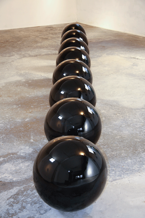 Rachel Morellet : Considering the definition of the word as the confrontation between the free manifestation of imagination and the presence of rules, it interests me; however, it is not always present in my work. I am interested in creating empathy with the audience, either during the creation phase as in the case of the work En forme or later, through meaning or title. So sometimes play is a tool I use for this purpose and sometimes it appears on its own: for example in the work Password, composed of eight black balls 50 cm in diameter placed in a row. I have always dreamed of making it out of hard stone so that it can be transformed into a material representation of a virtual graphic component as well as a game of leapfrog.