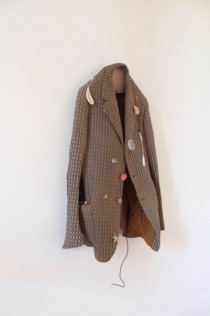 Giacca in tessuto e vari oggetti fatti, scelti e trovati. 2022