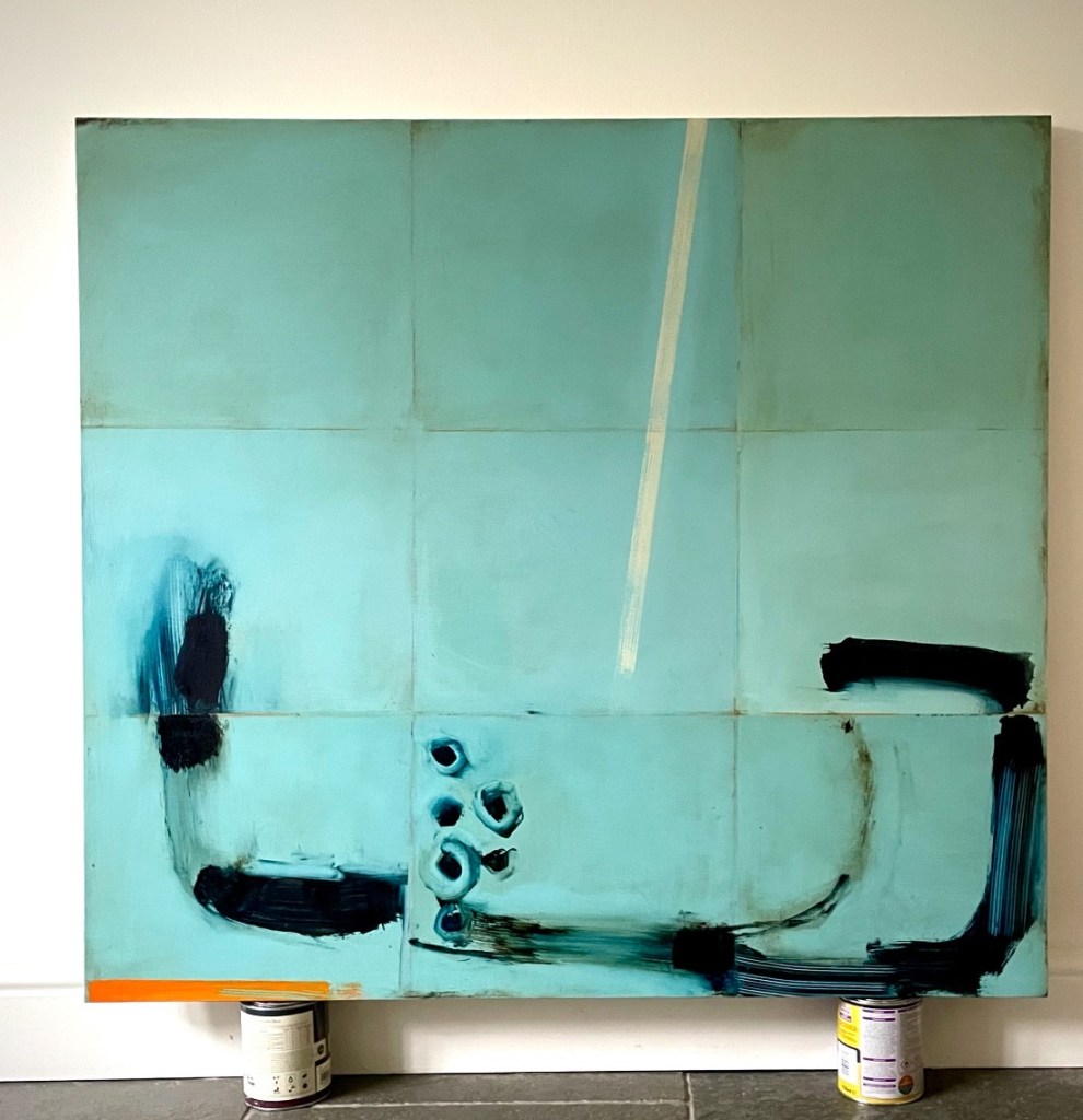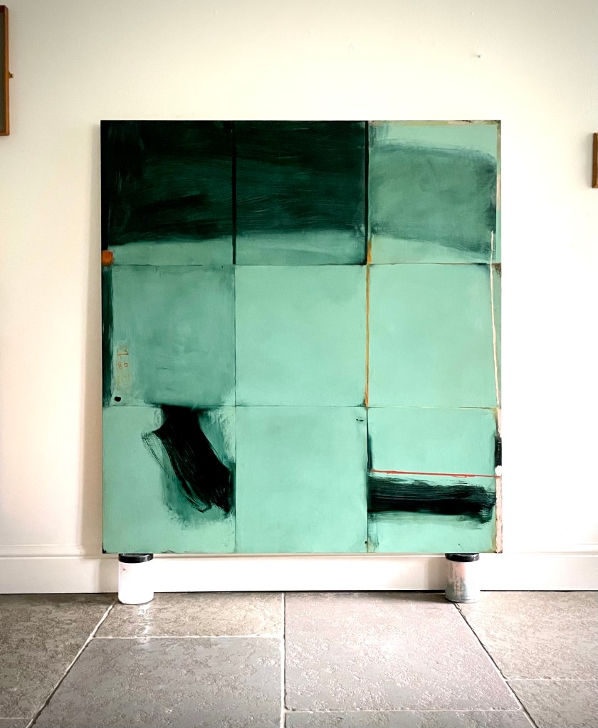I miei dipinti iniziano con uno strato di fondo, di solito rosa o blu, e poi strofino sopra uno strato di bitume (conservante per legno) per creare un aspetto afflitto. Questo ingiallisce leggermente, trasformando il blu in un verde/blu che adoro. Poi faccio una griglia di 9 rettangoli e lavoro su ogni sezione alla volta, dando l’impressione di una separazione che mi piace molto perché astrae ulteriormente l’immagine.