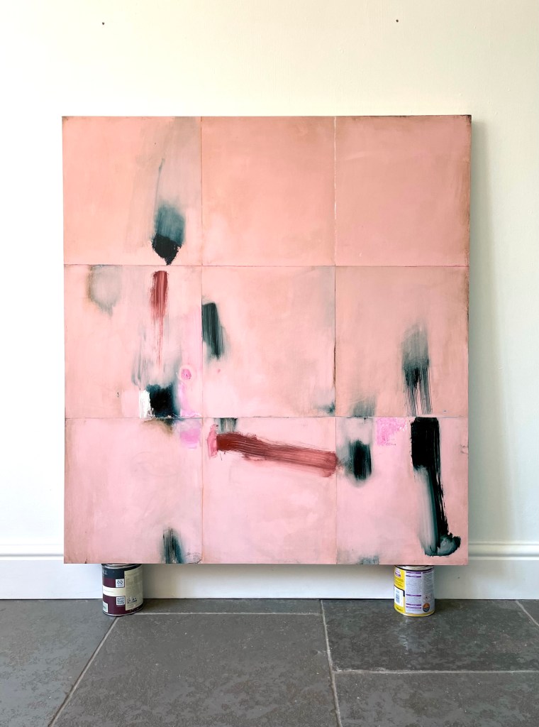 My paintings start with a ground layer, usually pink or blue and then I rub over a layer of bitumen (wood preserver) to create a distressed look. It yellows it slightly, turning the blue to a green/blue which I love. I then grid up into 9 rectangles and work on each section at a time, giving the appearance of separation which I really like as it further abstracts the image.