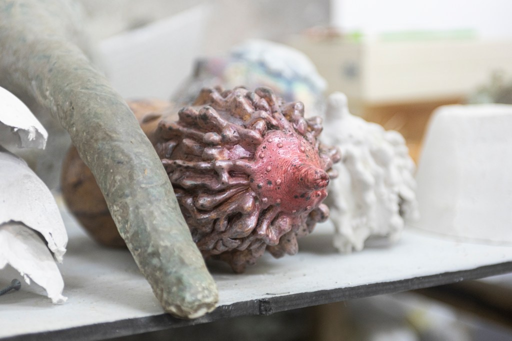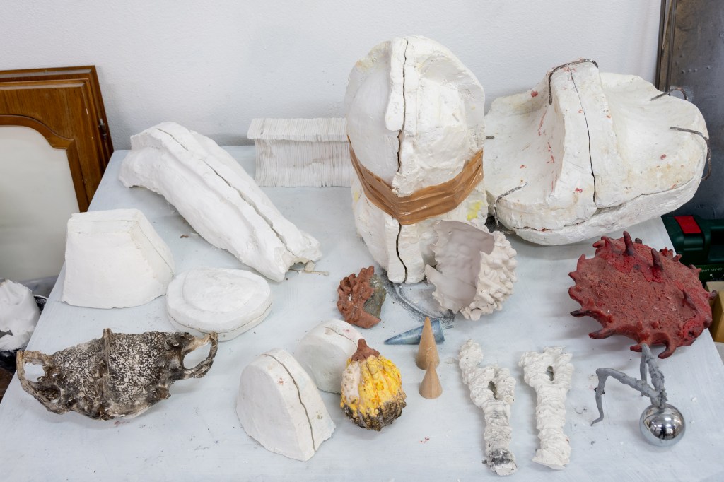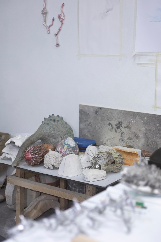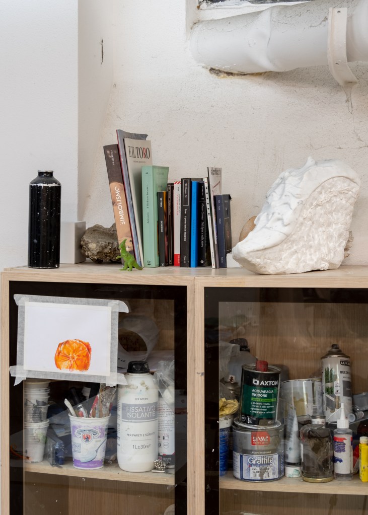 Con il tempo la mia postazione all’ interno dello studio si è costruita e trasformata in maniera proporzionale a come io stavo cambiando per via delle circostanze della vita. I libri, gli argomenti di studio, i confronti con artisti e altri professionisti, mi hanno permesso di immergermi in nuove esperienze e, contemporaneamente, di sedimentare in questo luogo qualsiasi oggetto, qualsiasi traccia – scarto o prova di una sperimentazione – come feticci di un piccolo tassello di conoscenza che aggiunge valore alla mia vita.