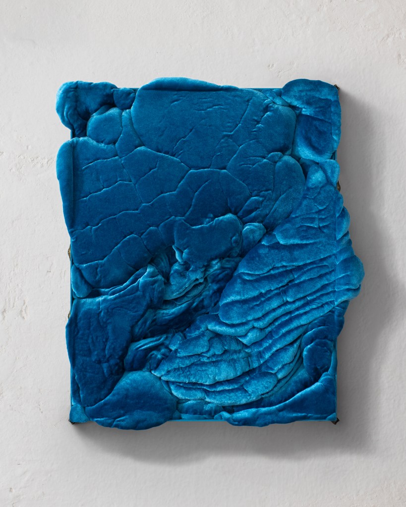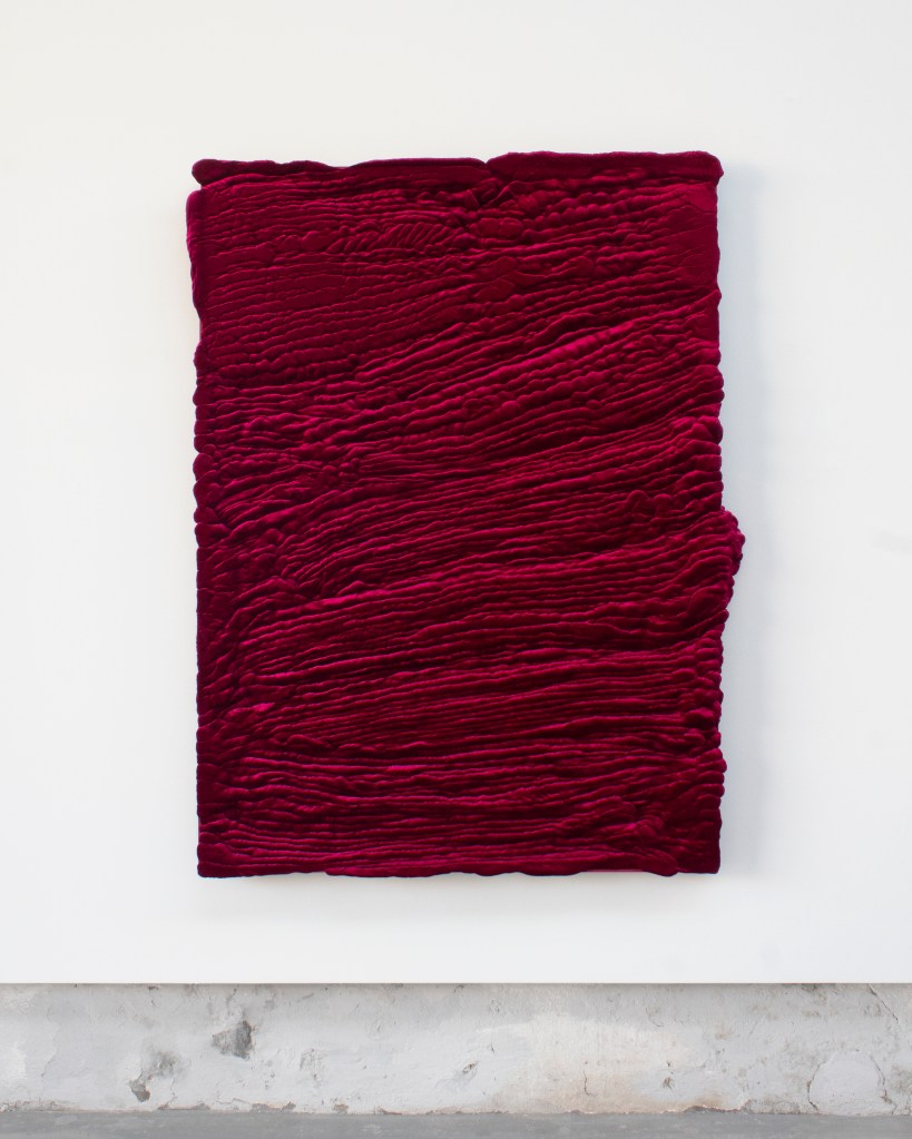 Filippo Moroni: My latest production is about this very idea. It is made with polyurethane foam and chenille velvet. What happens is a fact: the foam grows and advances across the surface of the support exactly like a parasite. It is then crushed, beaten, striated, tamed. It is a battle between me and the material that seeks an escape route. The fabric becomes one with the material underneath, hiding the ugliness and porousness of a crude, building concoction used for upholstery. At the same time, it contaminates and emphasises the material itself. My works are probably born out of shame. They could have their own name and be named after any person, as they make explicit and emphasise what each of us repeats every morning: we wear clothes that cover our bodies and allow us to show a new surface. We hide ourselves in plain sight.