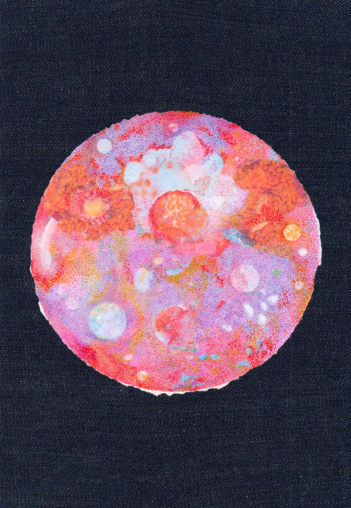 Sotto il selciato c’è la spiaggia, 2023. Tecnica mista su tela di jeans riportata su tavola, 30×20 cm. (dalla performance del 13 ottobre 2023)