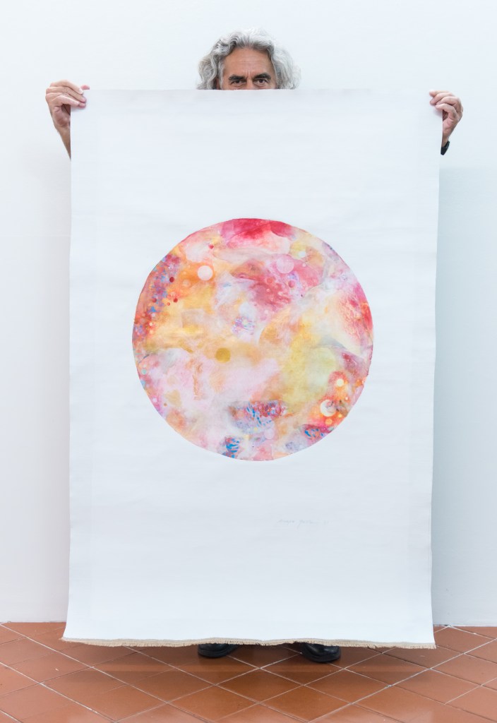 To draw is to disseminate signs, to find them, to let them emerge. To construct a design from the juxtaposition of small and tiny traces. Elements that together make up the totality, like infinitesimal but urgent and irreplaceable parts. Portions of an infinite universe, but ultimately ‘decomposable’ – or ‘composed’ – into millions of elements, like the cosmos, like us, human beings. It is not for nothing that the principal form par excellence, the one that recurs in every work, is the circle. A sort of Jungian mandala in which the artist, precisely, scatters his signs’. Some time earlier, Anna Fiordiponti (Facebook, 11 August 2017), also wrote… The term ‘scattering’ makes me think of two meanings: to mark any impulse twice on a piece of paper, or to erase it. But both actions almost involve meditation, long or short we do not know, the mind driven by talent “is nothing but a taste, a preference”: Angelo meditates on his preferences, he has innumerable of them and therefore needs to understand which, at a given moment, is for him the most consonant with his state of mind. He stops and time follows him step by step: ‘there is a Time for everything’.