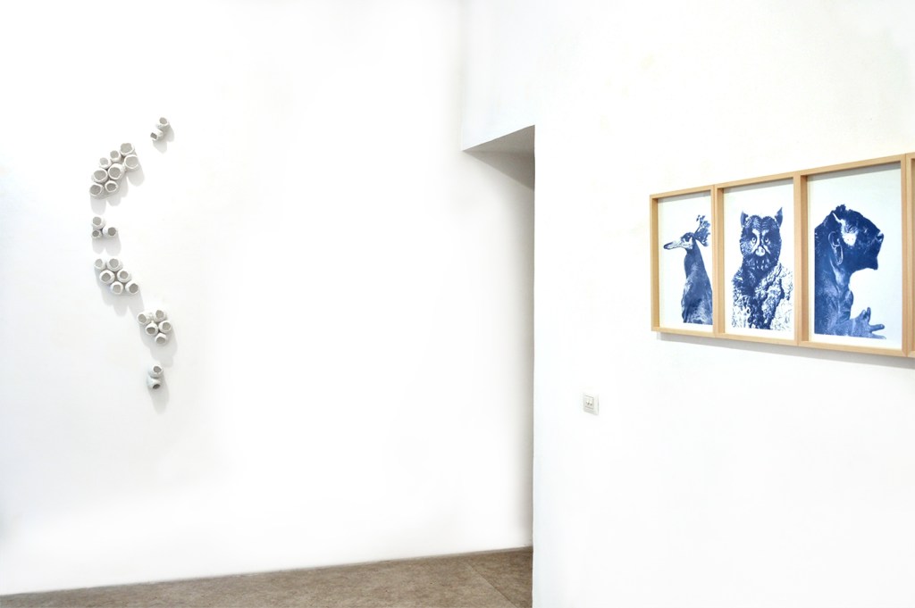 Così, per esempio, nelle opere “Teriomorfi”, collage stampati in cianotipia, i regni dei viventi ― – animali, funghi, vegetali ― convivono in un solo essere. Possiamo vedere queste creature come dei mostri completamente lontani da noi, oppure delle chimere fantastiche che pongono nuovi interrogativi, mettendo in discussione quello che consideriamo diverso. In quest’ultima prospettiva anche la dicotomia mostri-chimere perde significato, lasciando spazio alla sorpresa di condividere con queste creature parte della nostra natura.