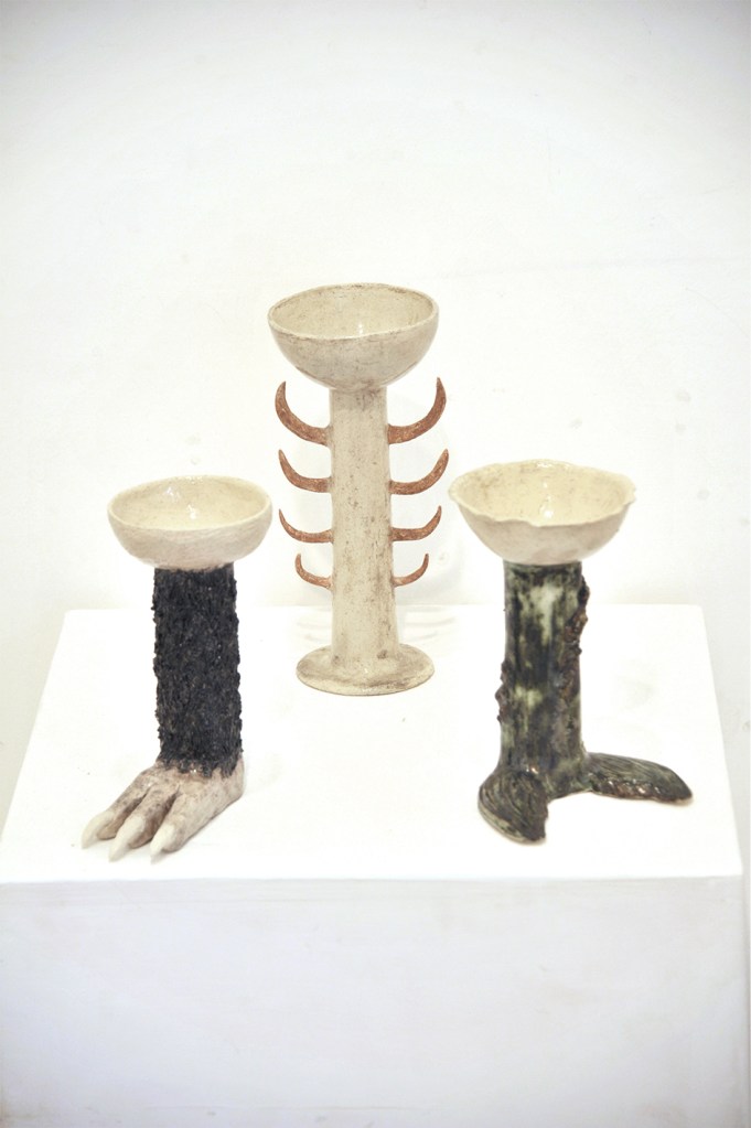 Le coppe totemiche della serie “Ierofanie”, invece, racchiudono elementi primitivi: ossa, conchiglie, squame, un arto dagli artigli pronunciati, una pinna su cui emergono incrostazioni. Questi oggetti in ceramica riprendono la coppa da libagione, usata nelle cerimonie religiose, e ne condividono lo spirito comunitario, un auspicio di una nuova alleanza tra gli esseri viventi.