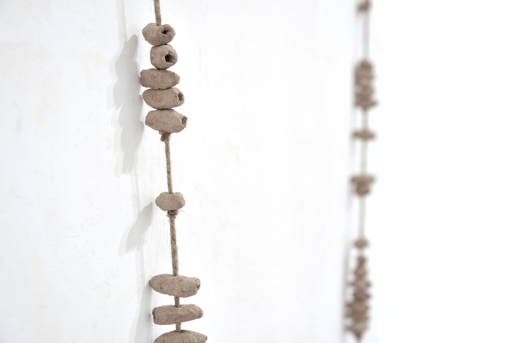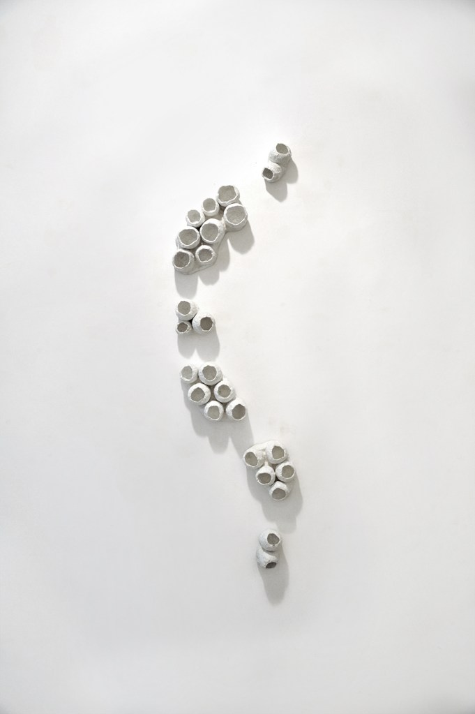 The works in papier mâché created with paper, glue and stucco explore metamorphic spaces where the void becomes a trace of the coexistence of different forms and natures.