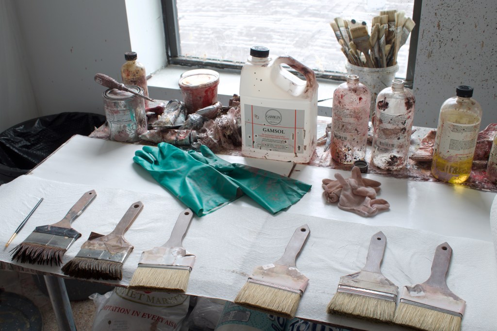 Alla fine di ogni giornata, devo pulire accuratamente i miei pennelli per il giorno successivo. Da quattro a sei pennelli piatti larghi e due pennelli da sfumatura in pelo di capra molto morbidi devono essere rimossi fino all’ultima traccia di pittura a olio con un medium e poi puliti con sapone all’olio d’oliva per renderli di nuovo morbidi. Li metto su tavolozze di carta pulite sul mio tavolo da lavoro accanto alla grande parete dove dipingo, in modo che siano asciutti in tempo. Al mattino, quando arrivo, la prima cosa che faccio è tornare ai pennelli e alle tavolozze pulite e mescolare i colori per il dipinto che mi aspetta. Il tavolo da lavoro è molto vicino alla finestra, il che mi permette di mescolare i colori alla luce del sole.